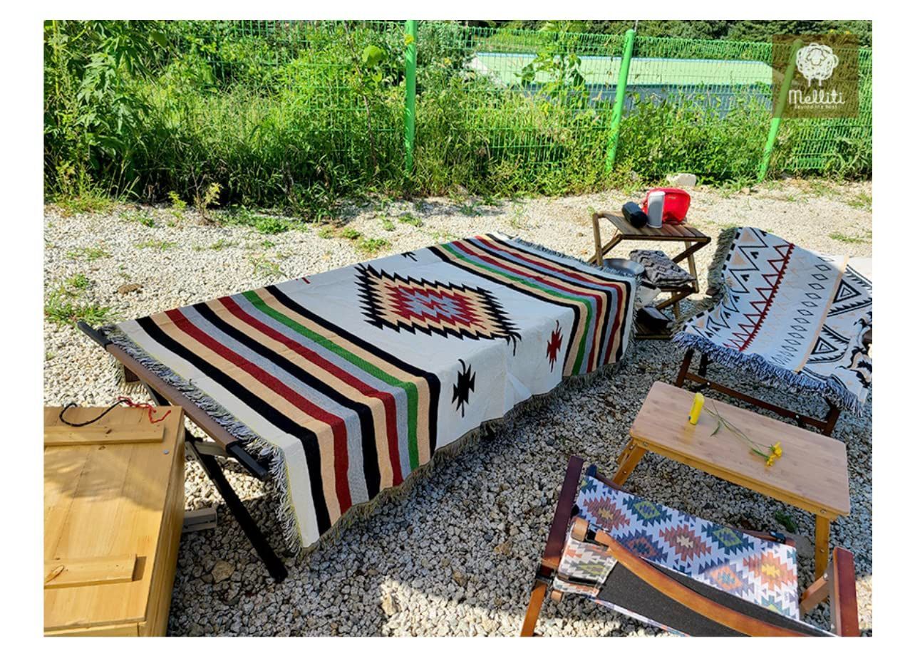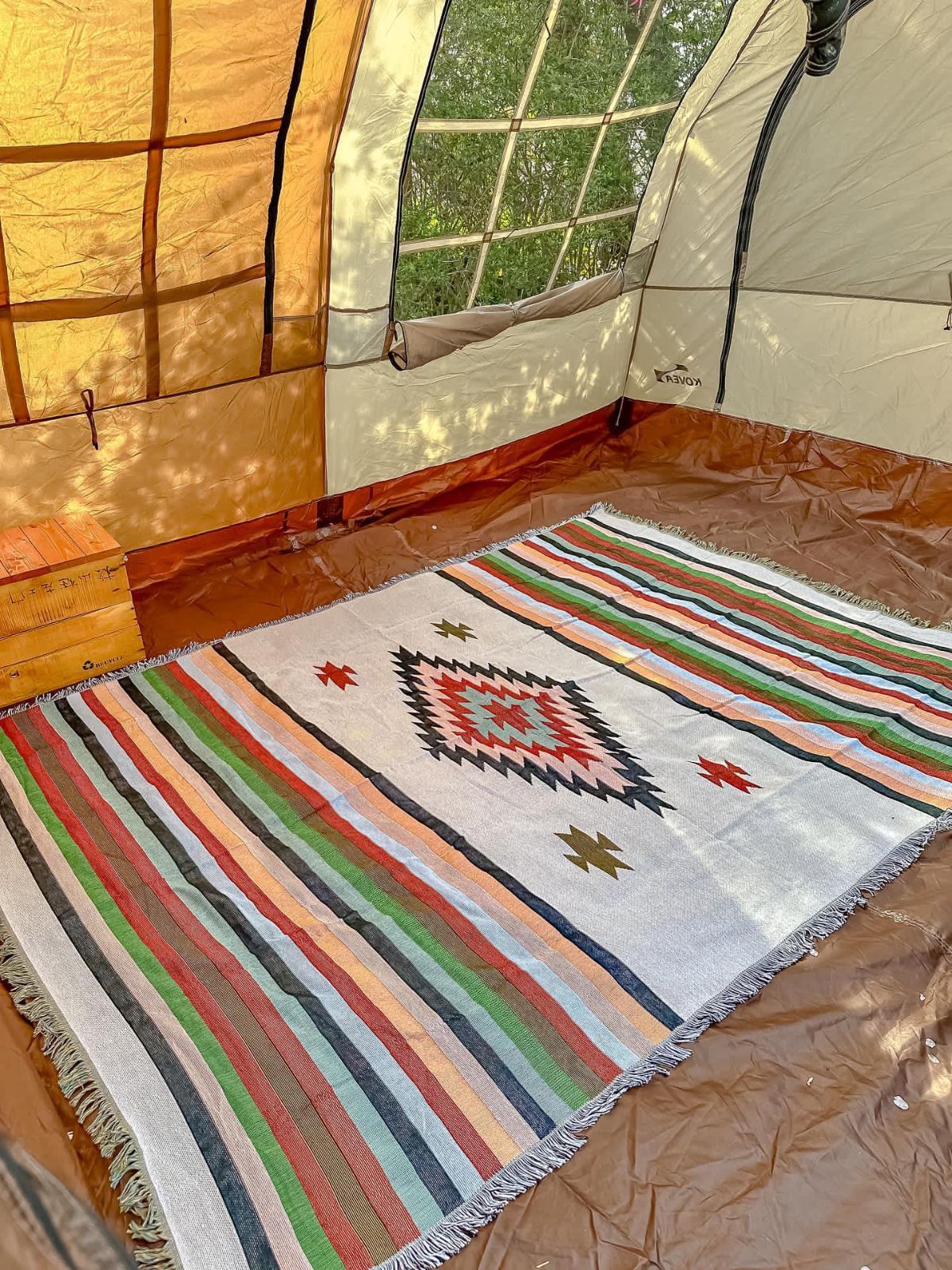 大判のメキシカンラグをコットの上に敷くだけで、まるで先住民が生活しているような空間に。ナチュラルな色あいのテントやテーブルに、メキシカンラグの派手めなデザインがマッチしています。