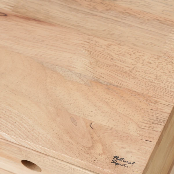 ラバーウッドならではの柔らかく穏やかな木目です。表面はラッカー塗装で保護されています。