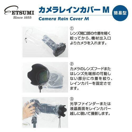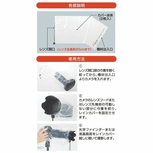 ※本製品は簡易レインカバーであり、完全防水ではありません。特にズーム操作でレンズ銅鏡が伸縮するレンズやフォーカス操作で先端が回転するタイプのレンズでは、カバーが外れていないか常に注意しながらご使用ください。