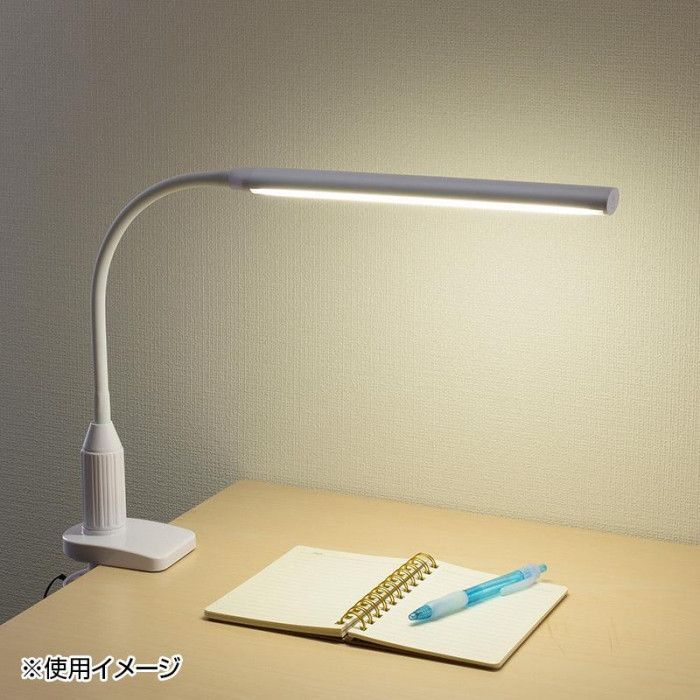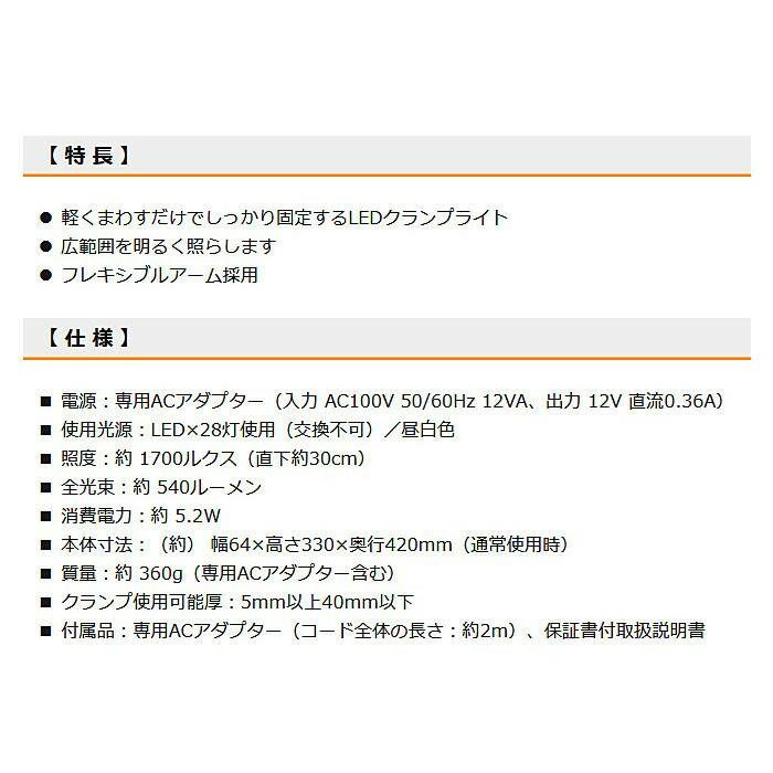 軽くまわすだけでしっかり固定するLEDクランプライトです。広範囲を明るく照らします。フレキシブルアームを採用しています。