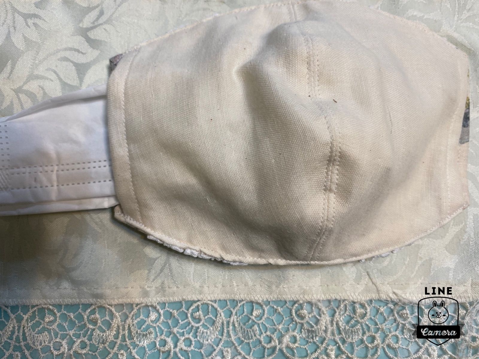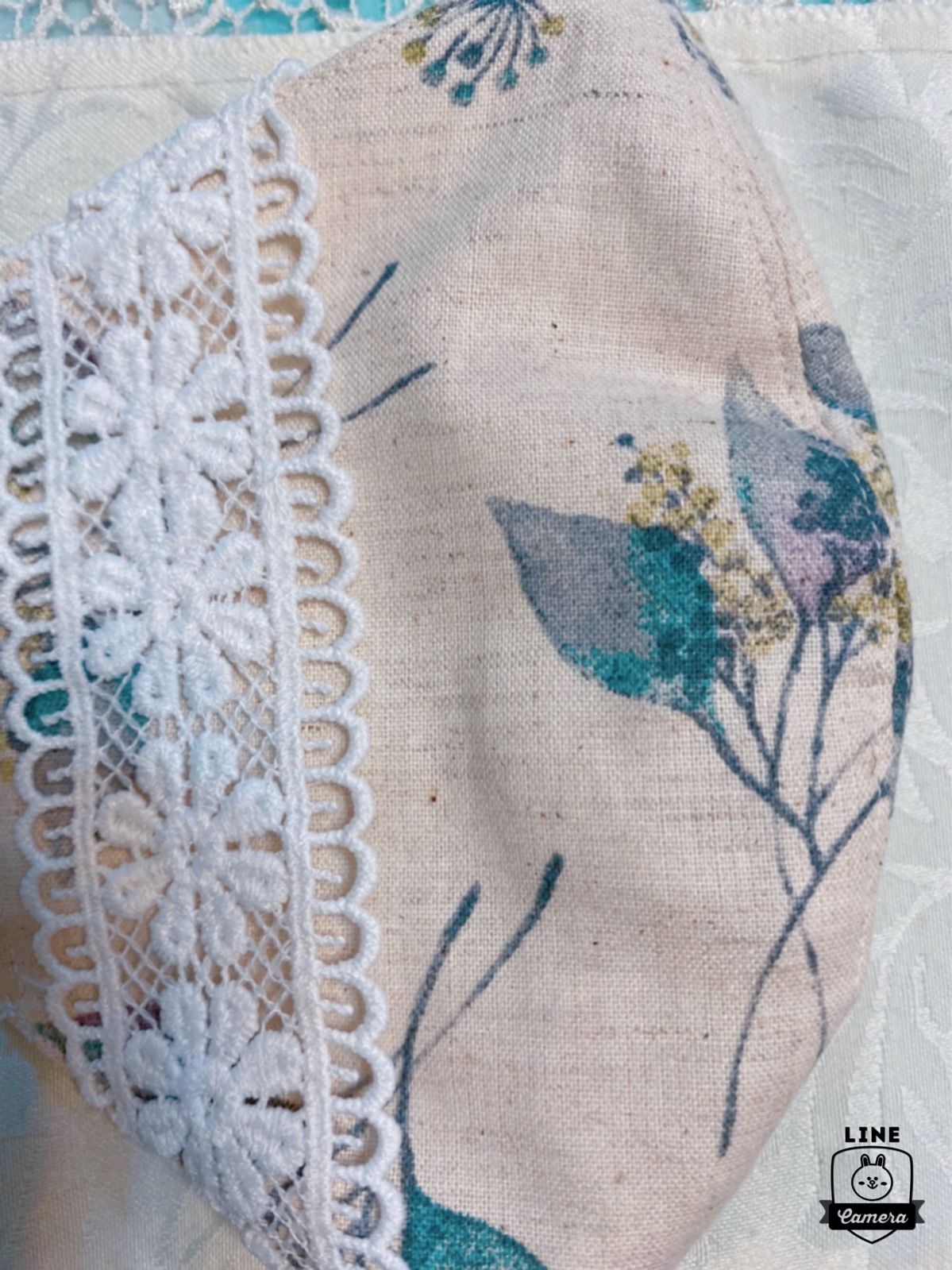 裏はダブルガーゼ綿100%生地きなりを、使用しました。レースも、お洒落な花柄を使用しました。