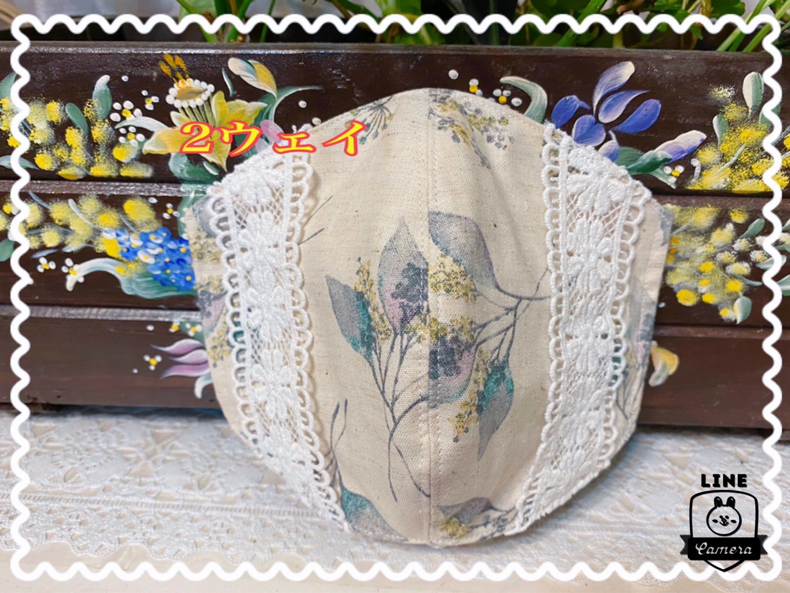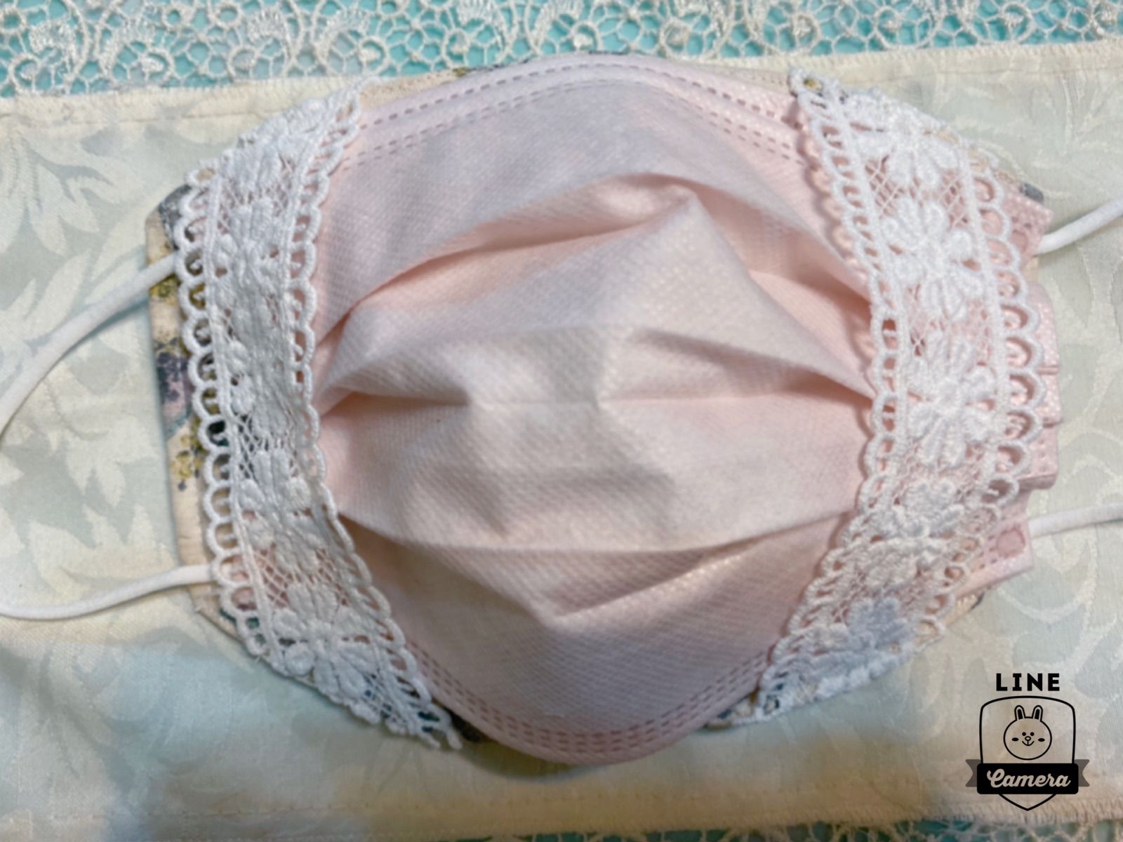 2.真ん中に不織布を折り畳み入れて中で広げます。全面お洒落な生地も、可愛いレース帯も見えます。口元には優し今ガーゼ生地が!不織布が苦味な方も大丈夫