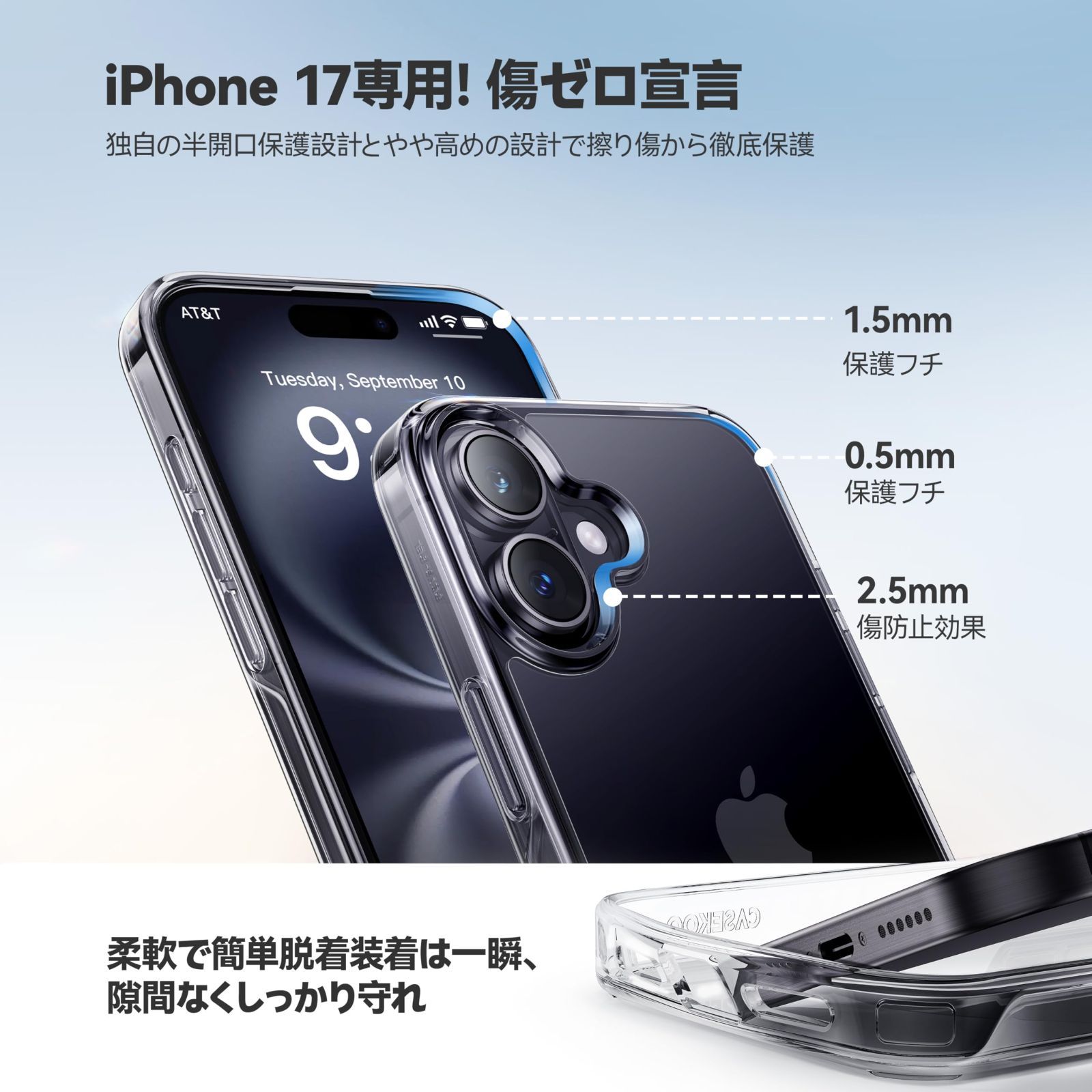 【極々透明感・2025年革新耐黄変技術】CASEKOO iPhone 17 用 ケース クリア 米軍MIL規格 透明 黄変防止 耐衝撃 高耐久性 ストラップホール付き ワイヤレス充電対応 あいふおん17用ケース 6.3 インチ「KORI」(クリア)