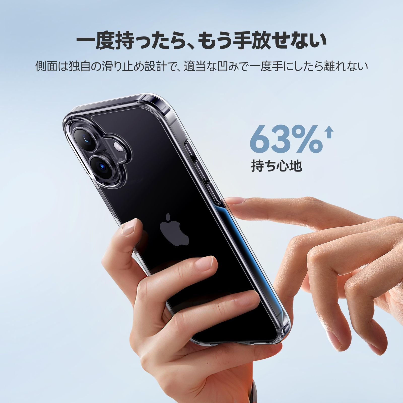 【すごく持ちやすさ・新感覚のフィット感】「窪んでいる方が持ちやすい」という発想から、人間工学に基づいて両側に適度な凹みを設計し、掌にぴったりフィット。高透明度ポリカーボネートとドイツ製TPU素材を使用し、装着・脱着も簡単。滑りにくさが5倍向上し、持ち心地が従来品より63%改善。手にしっかり馴染み、滑り落ちる心配もありません。対応機種:iphone17ケース