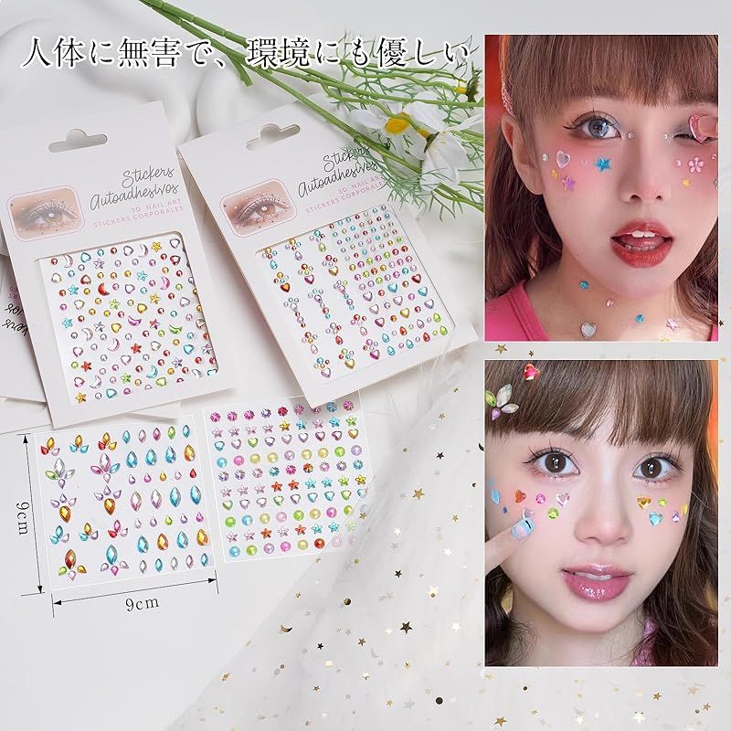 【強力な粘着力で、長持ち】フェイスラインストーンは安心無毒な材質を使用し、強力な粘着力を持ちながら人体に無害で、環境にも優しいです。接着後はできるだけ触れないようにして、一日中落ちないことができます