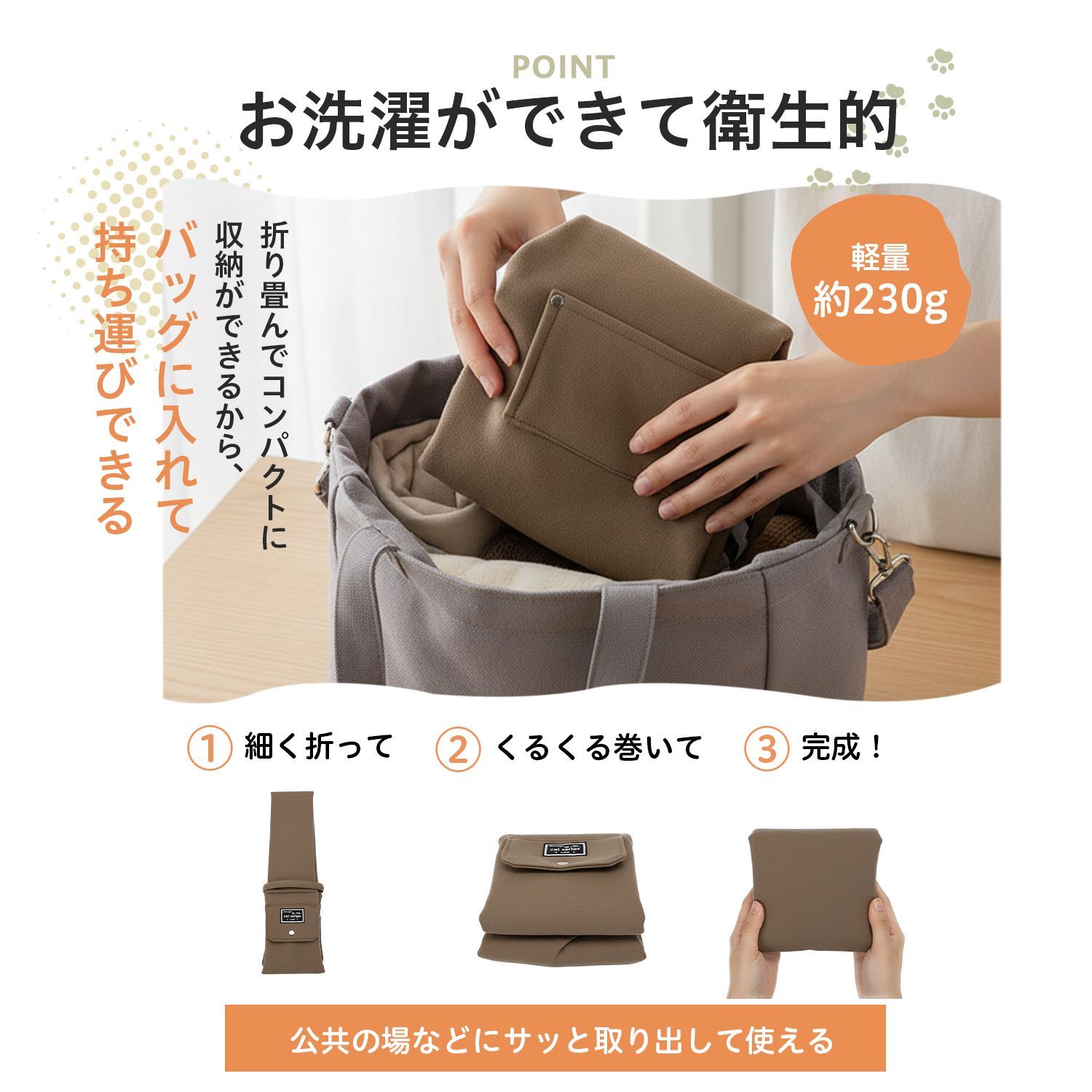 小物を入れられるポケットも付いており、スマホやおやつの持ち運びにも便利です。