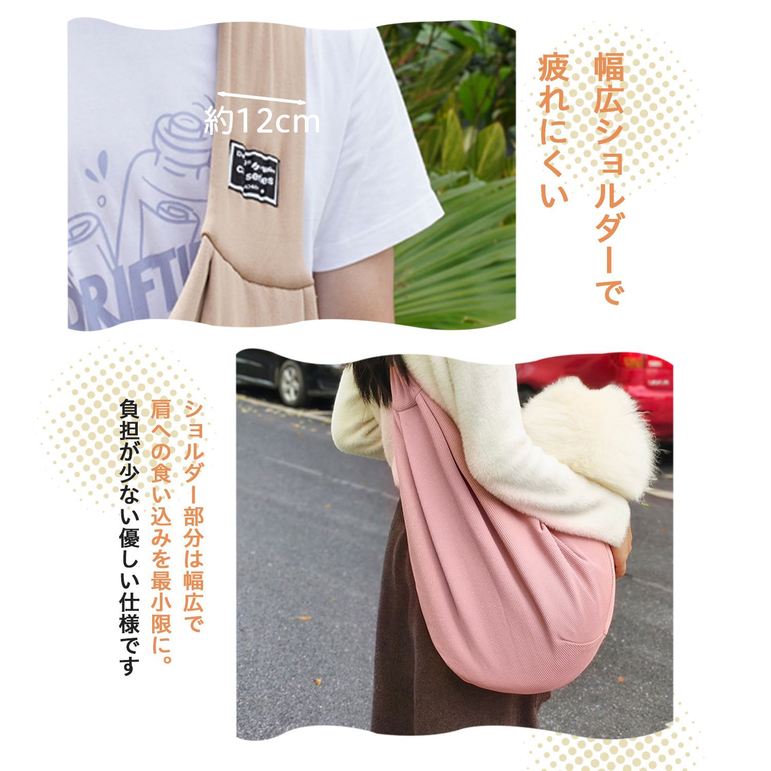 幅広ショルダーベルトで肩への負担を軽減