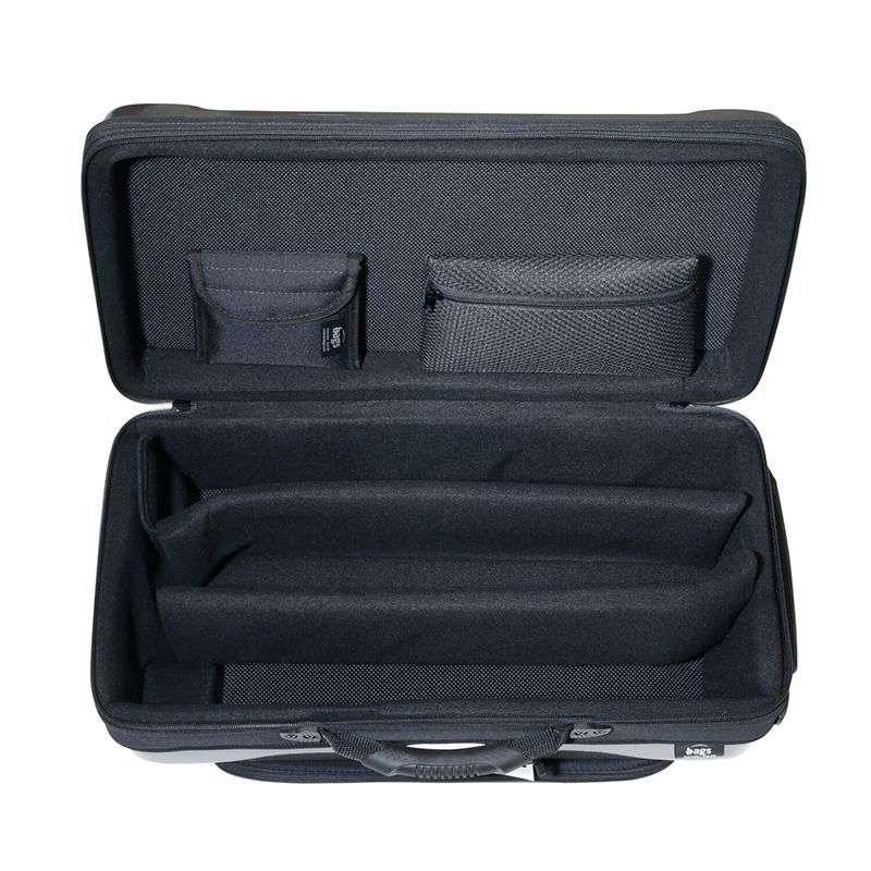 トラックへの積み込み時もスペースを有効活用できる形状に加え、内装も大幅にアップデート。中央に広めの小物収納スペースを設けており、ミュートやお手入れ用品はもちろん、ピッコロトランペットも収納可能です。さらに、マウスピースを3本収納可能な専用ポーチも付属。頻繁に楽器を持ち替えるトランペッターに最適な、実用性とデザイン性を兼ね備えたケースです。