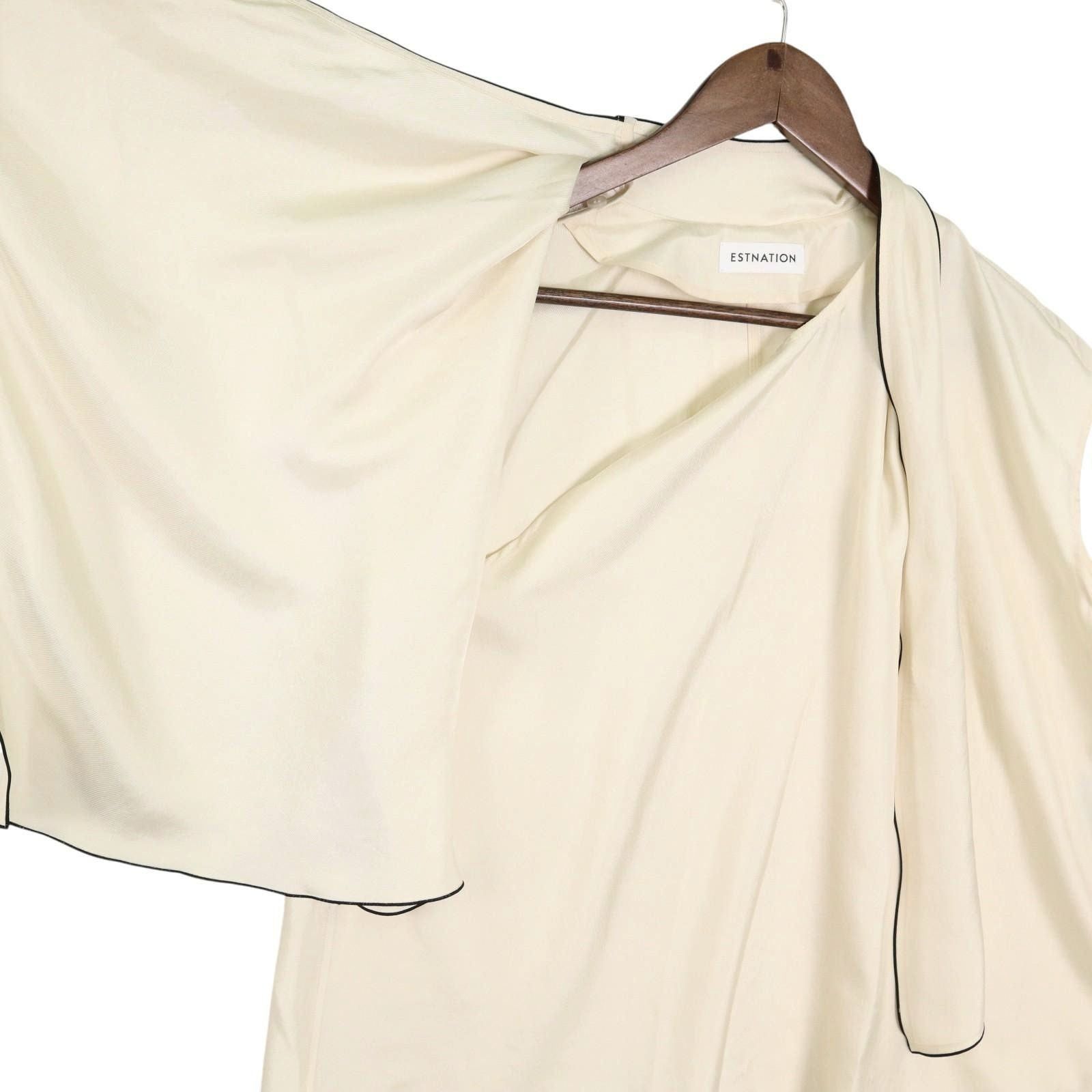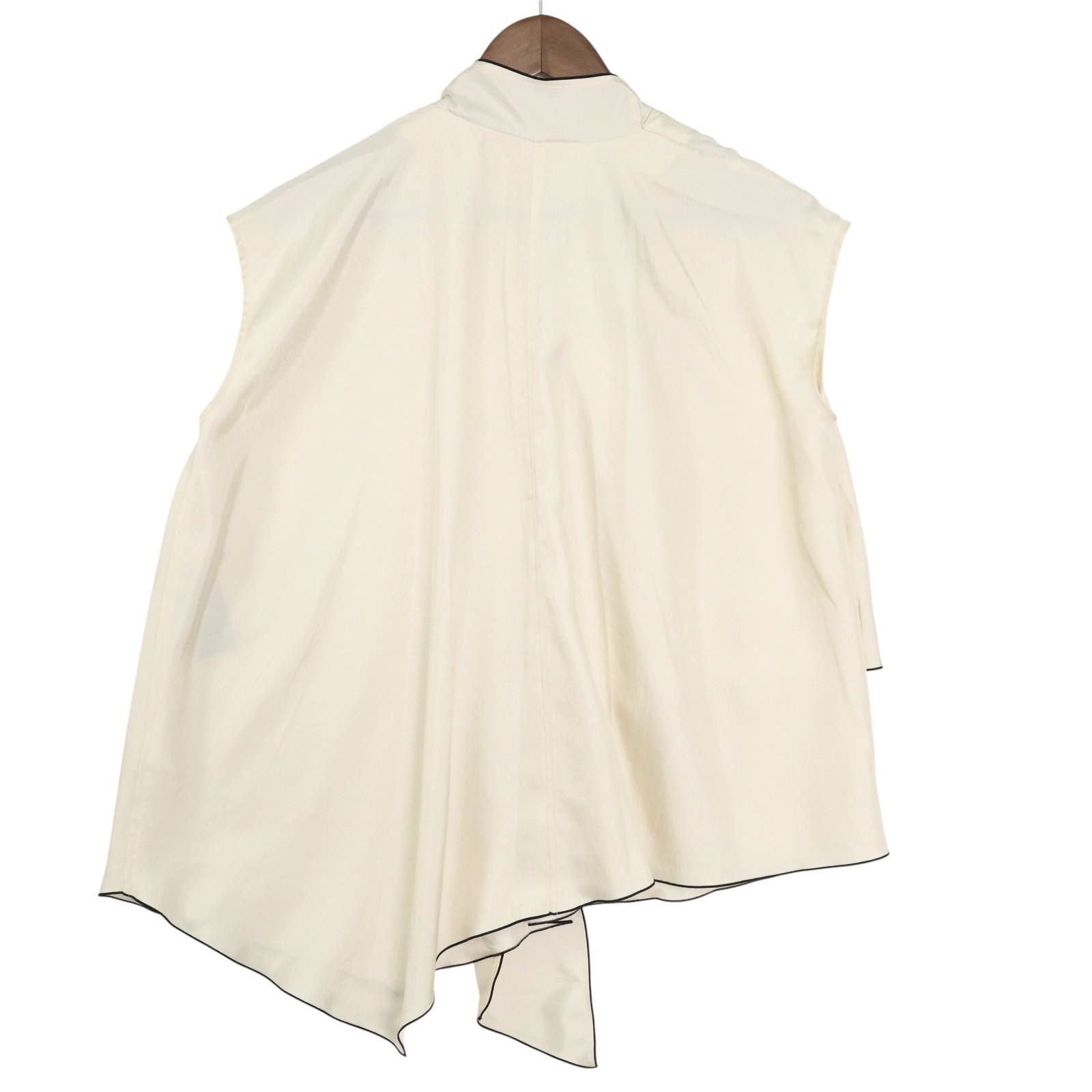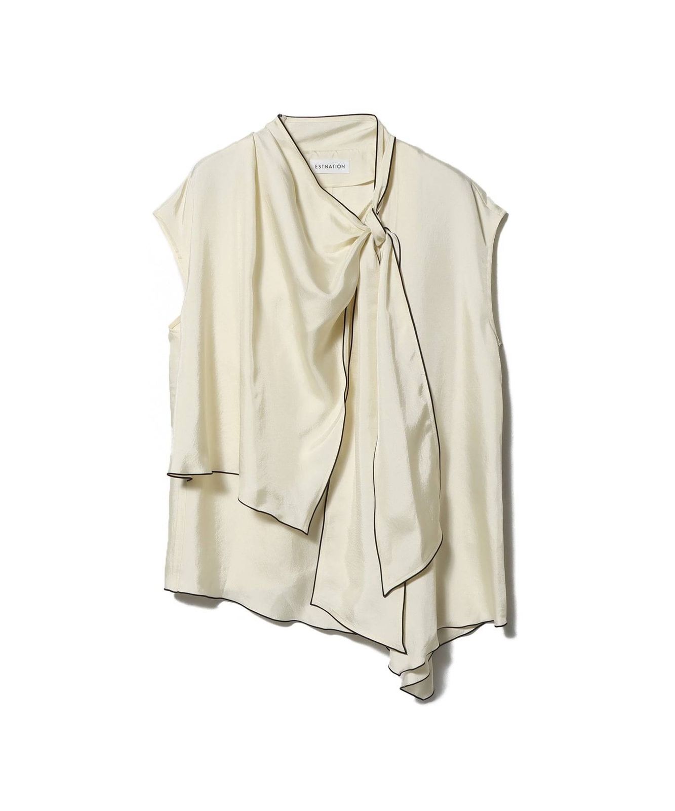 上品な光沢のあるツイル組織の素材を使用したブラウス。バイヤスカットでドレープを出し、襟ぐりから続くボータイがポイントのデザインです。