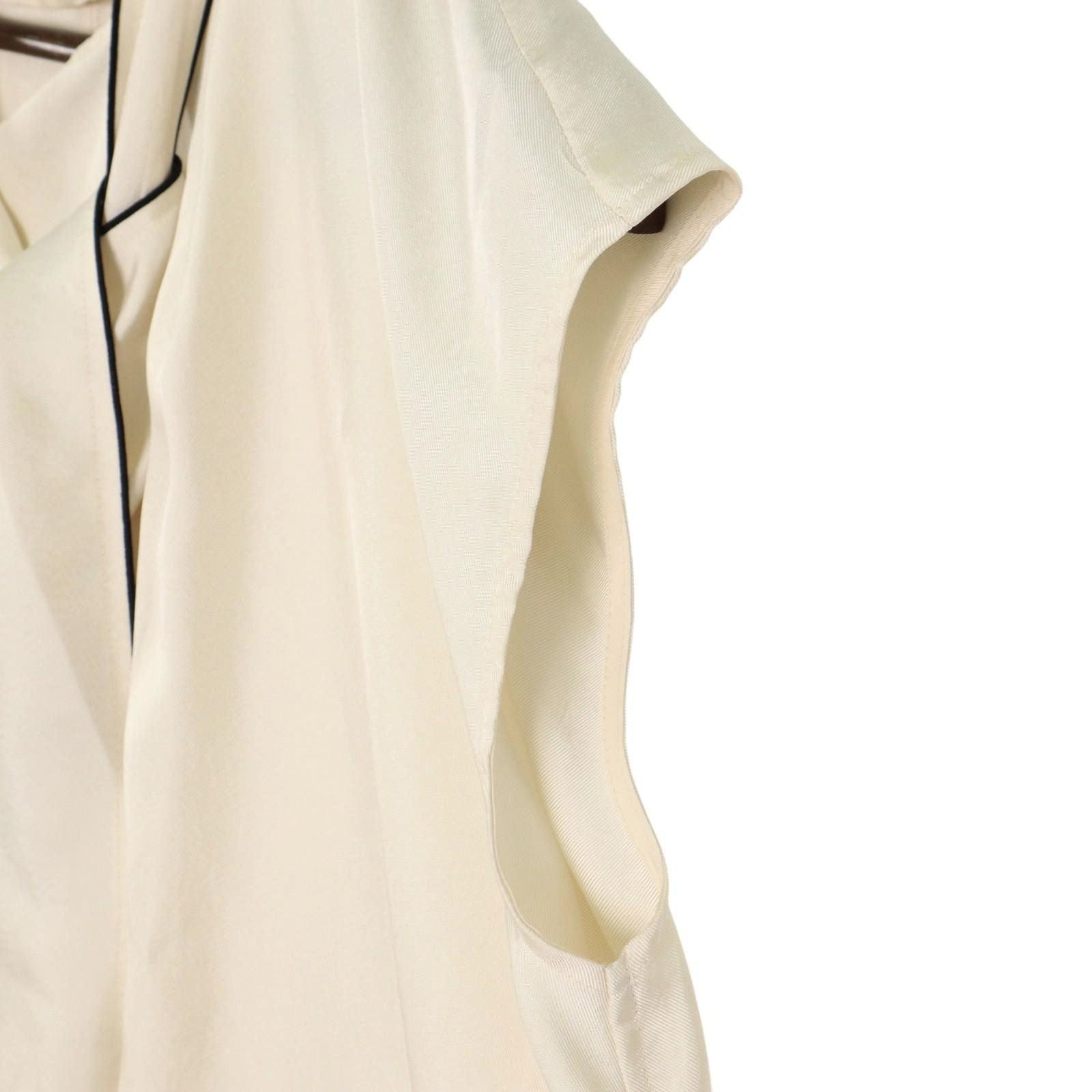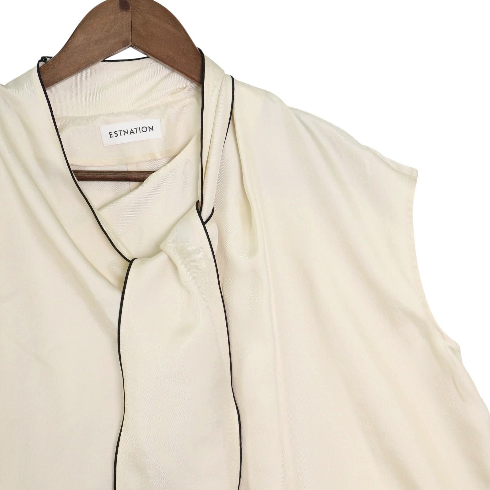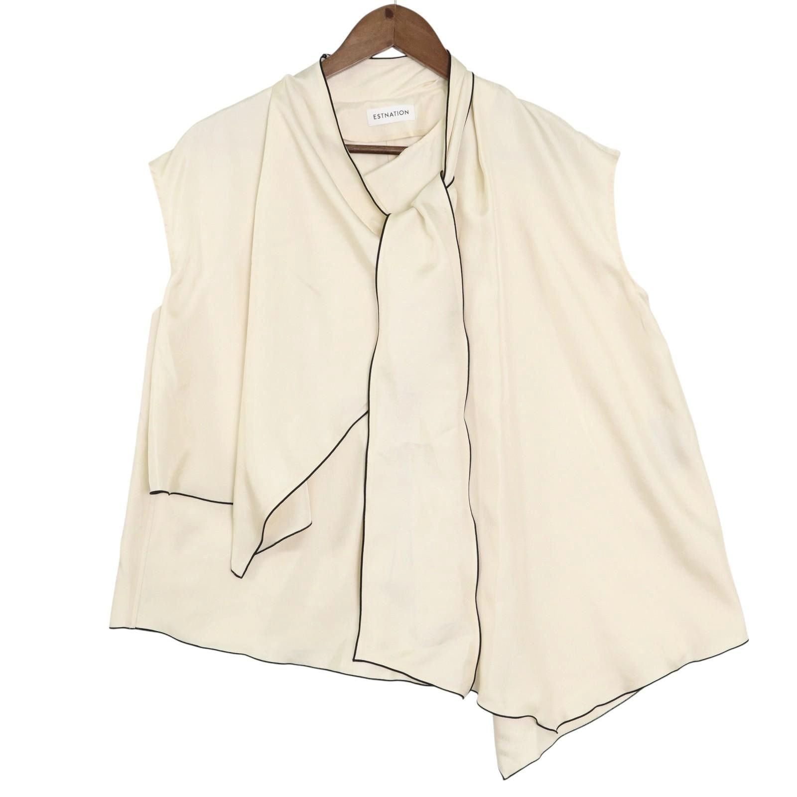 上品な光沢のあるツイル組織の素材を使用したブラウス。バイヤスカットでドレープを出し、襟ぐりから続くボータイがポイントのデザインです。