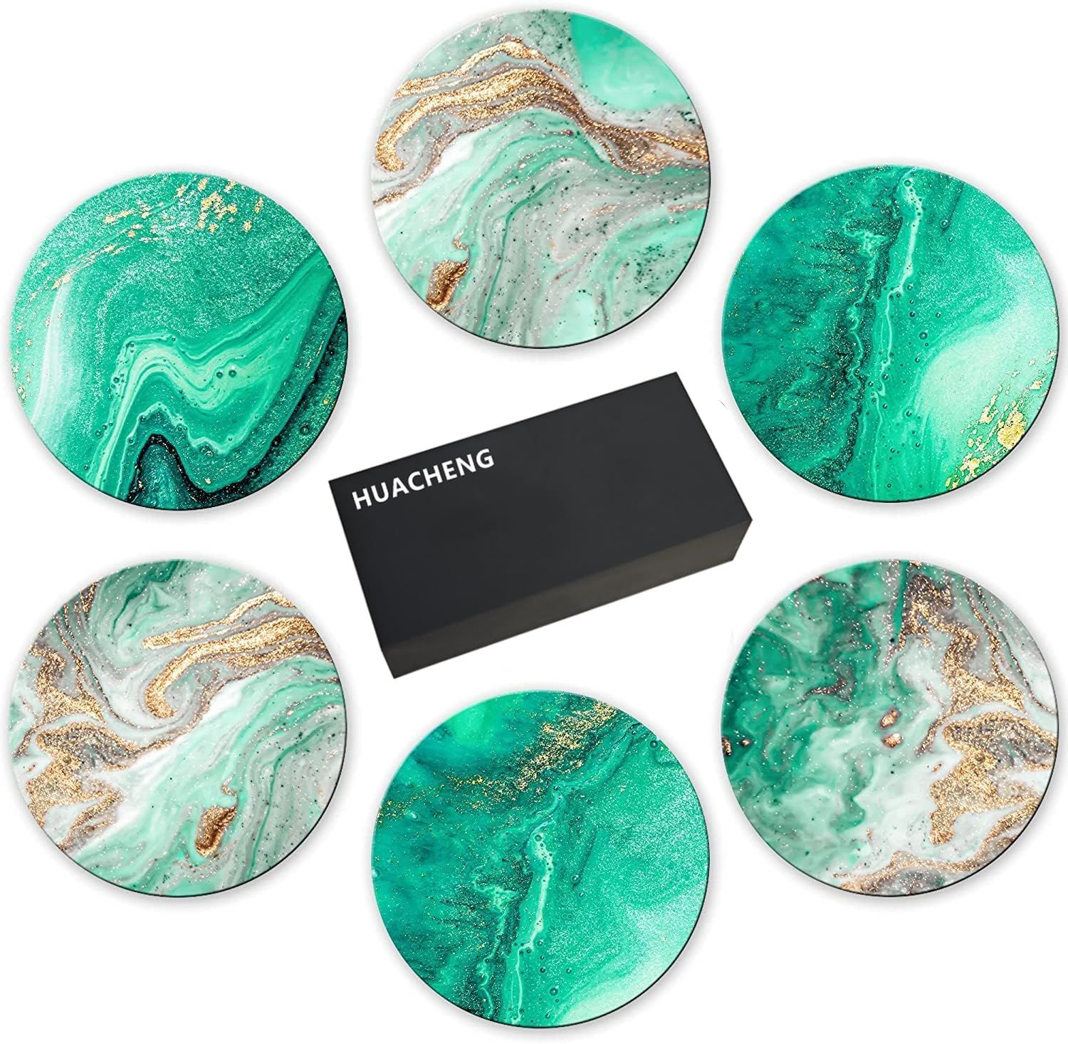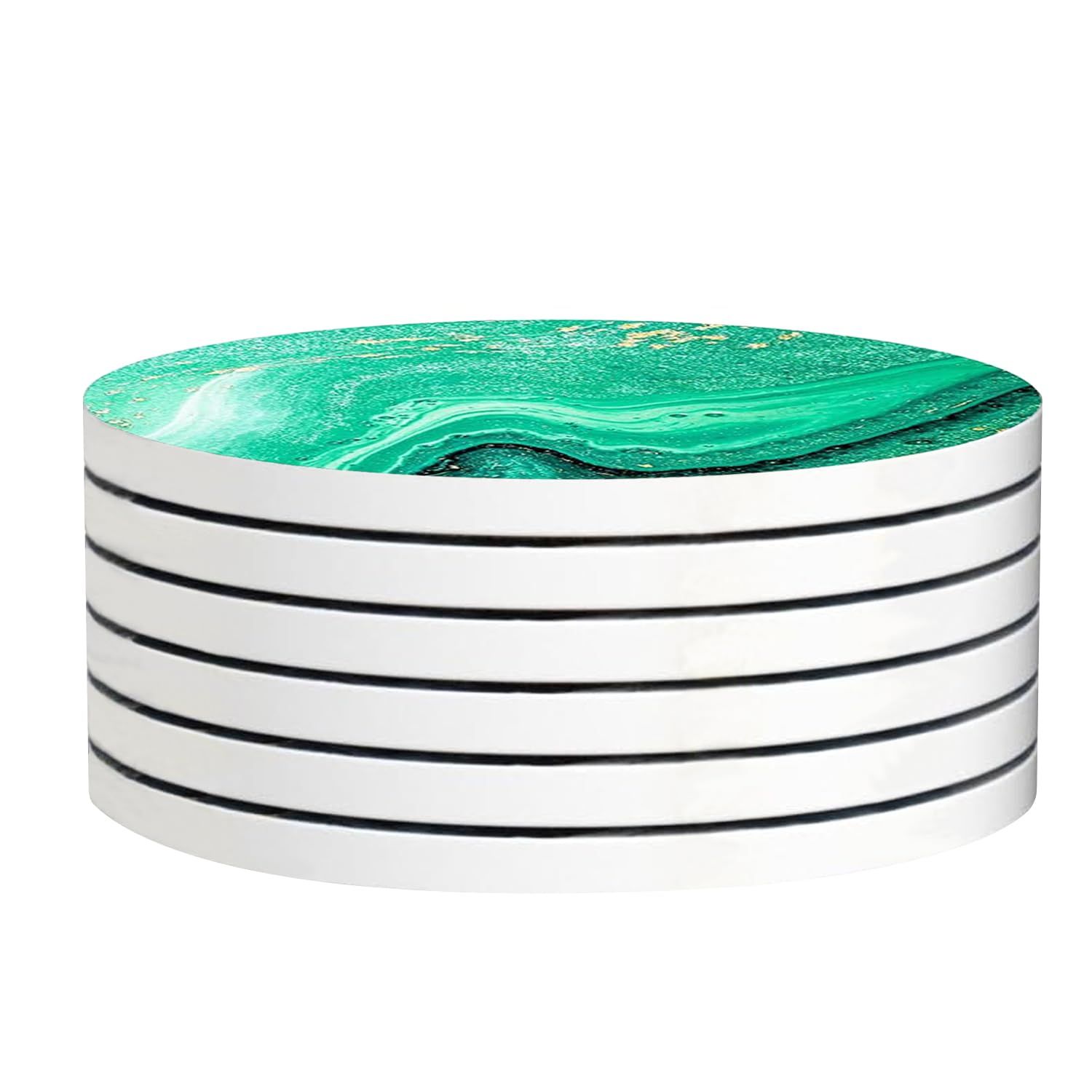 HUACHENG コースター おしゃれ 6個セット セラミック製 大理石模様 耐熱 保護コルク裏面 マグ お茶パッド カップマット 吸水 速乾 断熱 滑り止め 家庭用 オフィス用 ボヘミアン風 丸型 (グリーン)