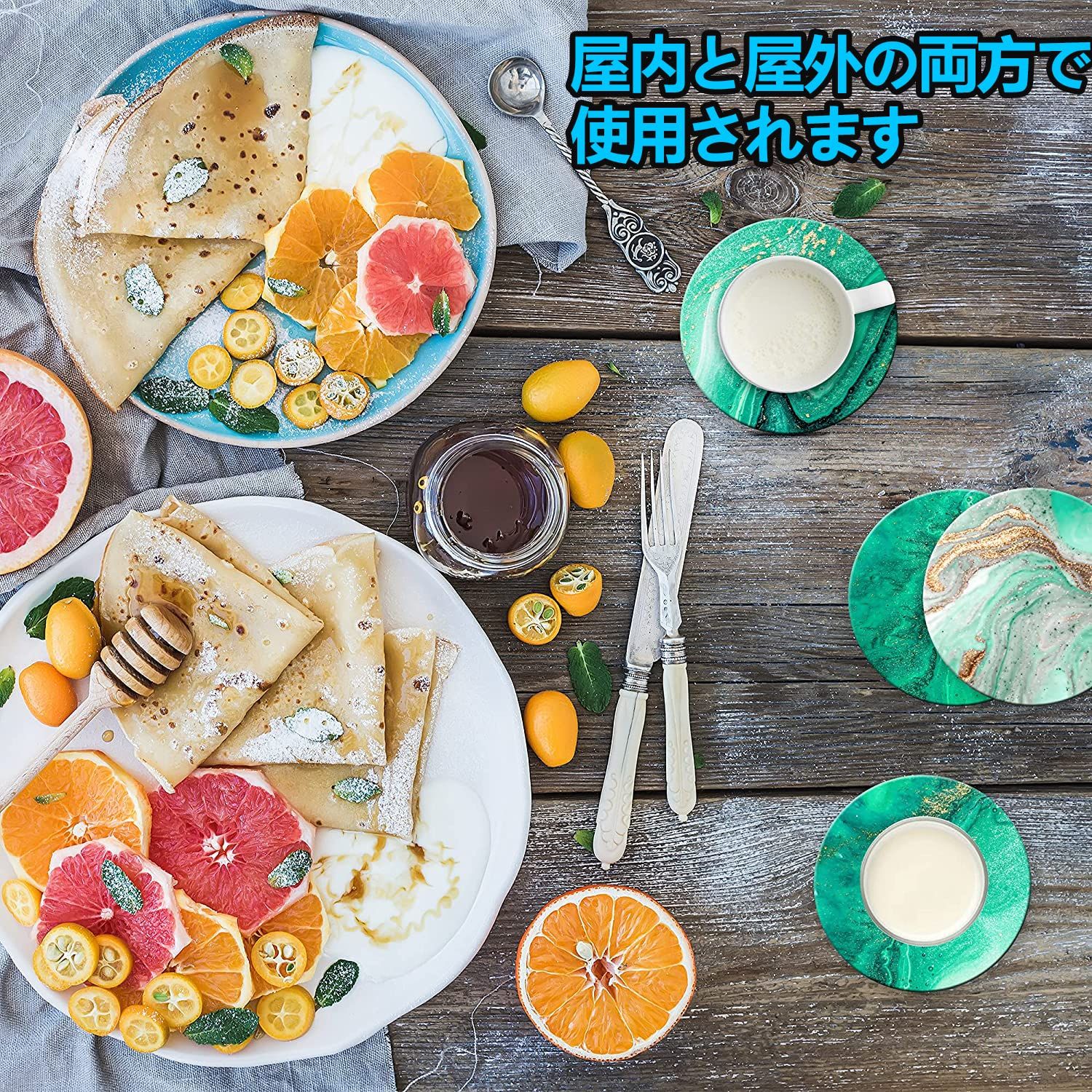【高品質】当社のセラミックコースターは、表面に吸収性セラミックを使用し、底には柔らかいコルクを使用しています。断熱性がよく、高温の飲み物や食器による机へのダメージを防ぐことができます。吸水性があり、冷たい飲み物が溶けた時の結露や残された汚れを素早く吸収し、コースターは、机の乾燥や清潔を保ち、湿気を防ぎ、細菌を抑えます。カップコースターは、テーブルトップを引っかき傷から保護するための滑り止めコルクバッキングを備えています。また、なめらかな机でも滑らないようにする滑り止め机能もあり。