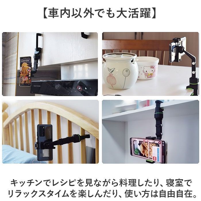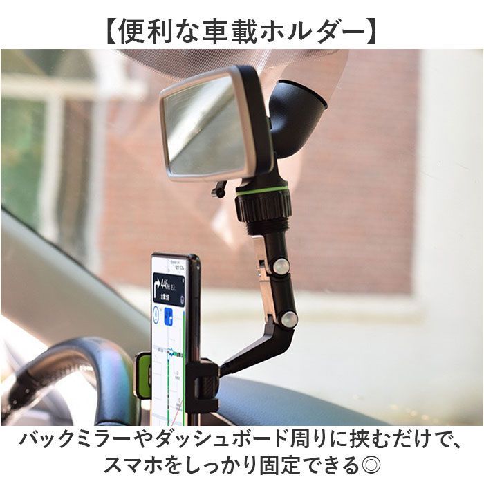 バックミラーやダッシュボード周りに挟むだけで、スマホをしっかり固定できる◎