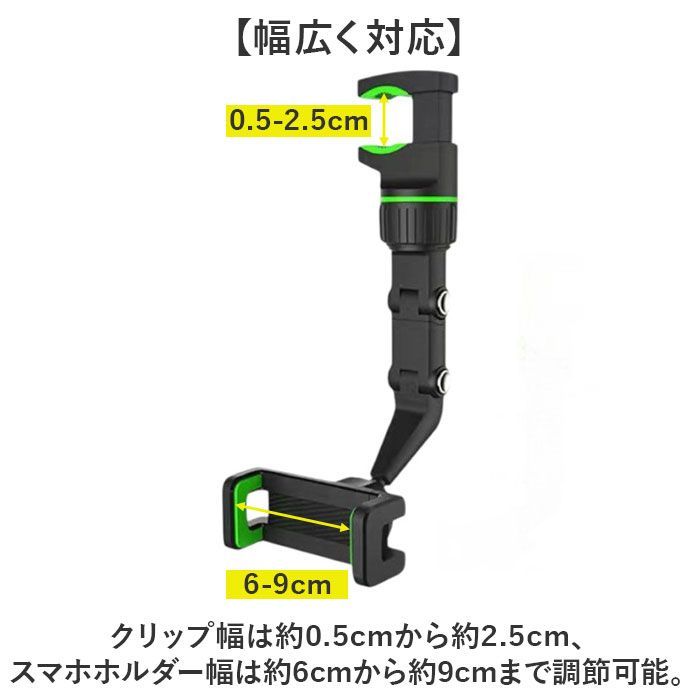クリップ幅は約0.5cmから約2.5cm、スマホホルダー幅は約6cmから約9cmまで調節可能。