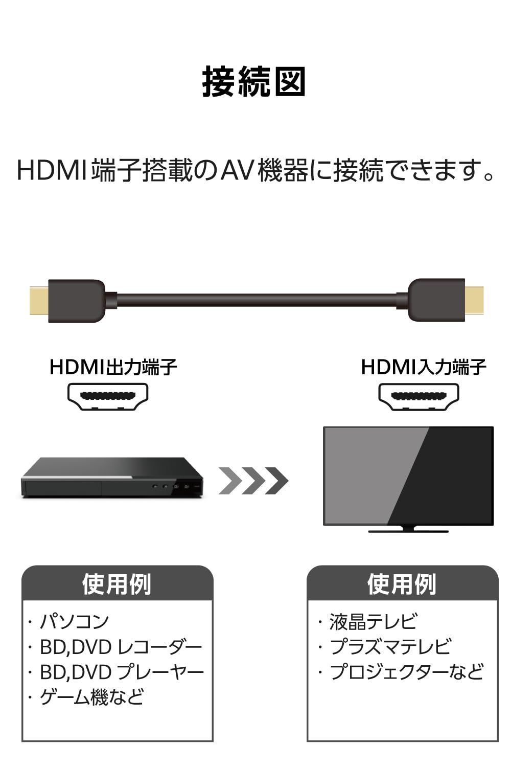 ■対応機種:HDMI(タイプA・19ピン)側:HDMI入力端子を持つ液晶テレビ、プラズマテレビ、プロジェクター等、HDMI(タイプA・19ピン)側:HDMI出力端子を持つAV機器、ゲーム機等 ■規格:Premium High Speed HDMI Cable with Ethernet (HDMI 2.0)認証 ■コネクタ形状1:HDMIプラグ(タイプA・19ピン) ■コネクタ形状2:HDMIプラグ(タイプA・19ピン) ■ケーブルタイプ:スタンダード ■伝送速度:18Gbps ■対応解像度:最大4K(3840×2160px)/60Hz ■シールド方法:3重シールド ■プラグメッキ仕様:金メッキ ■ケーブル長:約5m ※コネクター含まず ■ケーブル径:約7.8mm ■カラー:ブラック ■パッケージ形態:袋+ステッカー ■環境配慮事項: EU RoHS指令準拠(10物質)、簡易パッケージ
