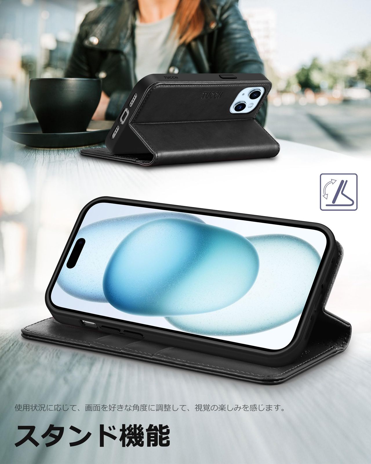 ★【適用型番&横置きスタンド機能】iPhone 15(2023年発売6.1インチ)のみ対応します、他の機種は対応しません。機種と画面サイズをご確認の上、ご購入ください。iPhone 15 ケースは自由に調整できる横置きスタンド機能が付き、動画視聴を思う存分楽しめます。