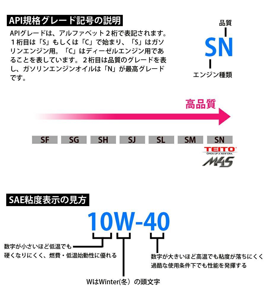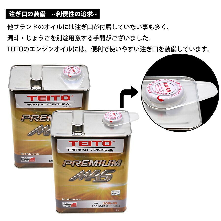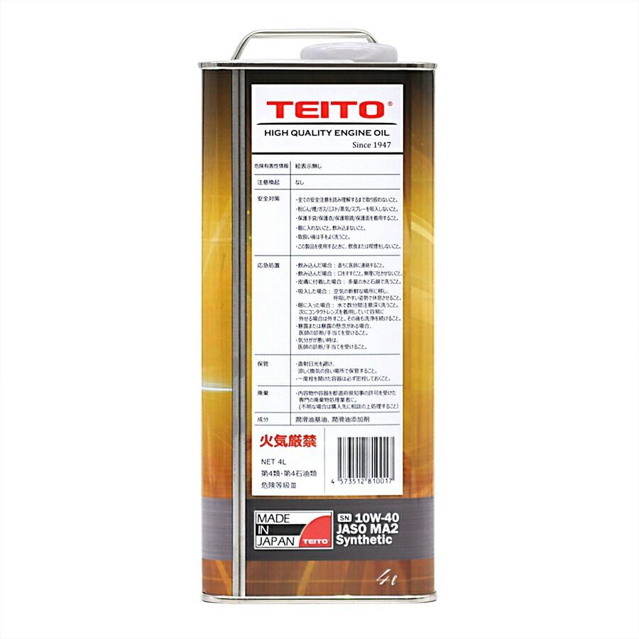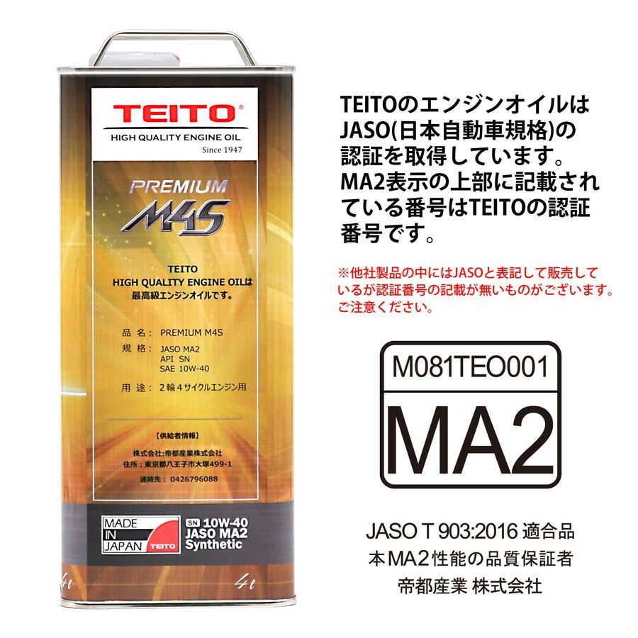 【TEITO エンジンオイル プレミアム M4S MA2 10W-40 化学合成油 SN 4L】