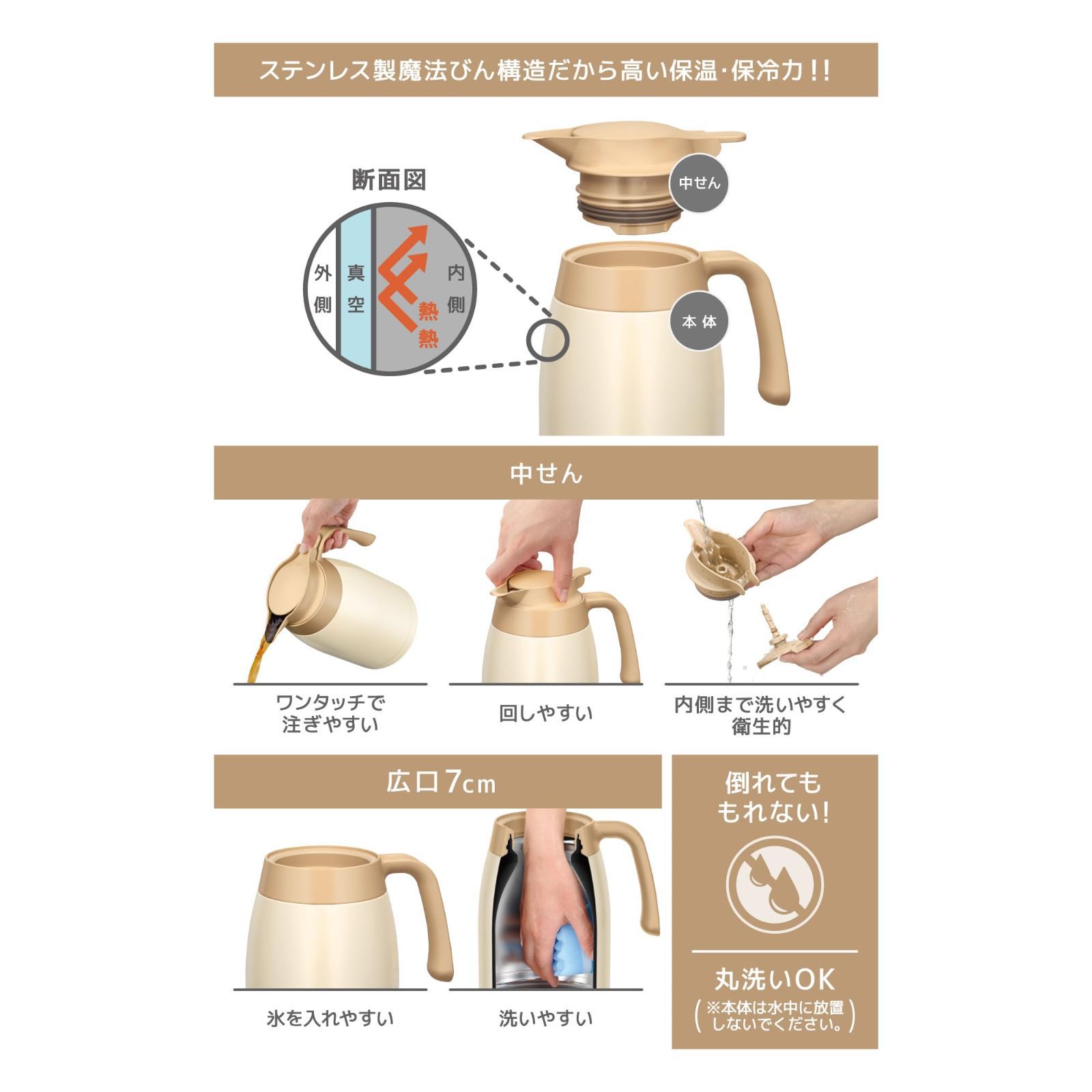 ●ステンレス素材を生かしたシンプルなデザインのポットは、保温も保冷もでき、飲み物を最適の温度でキープ