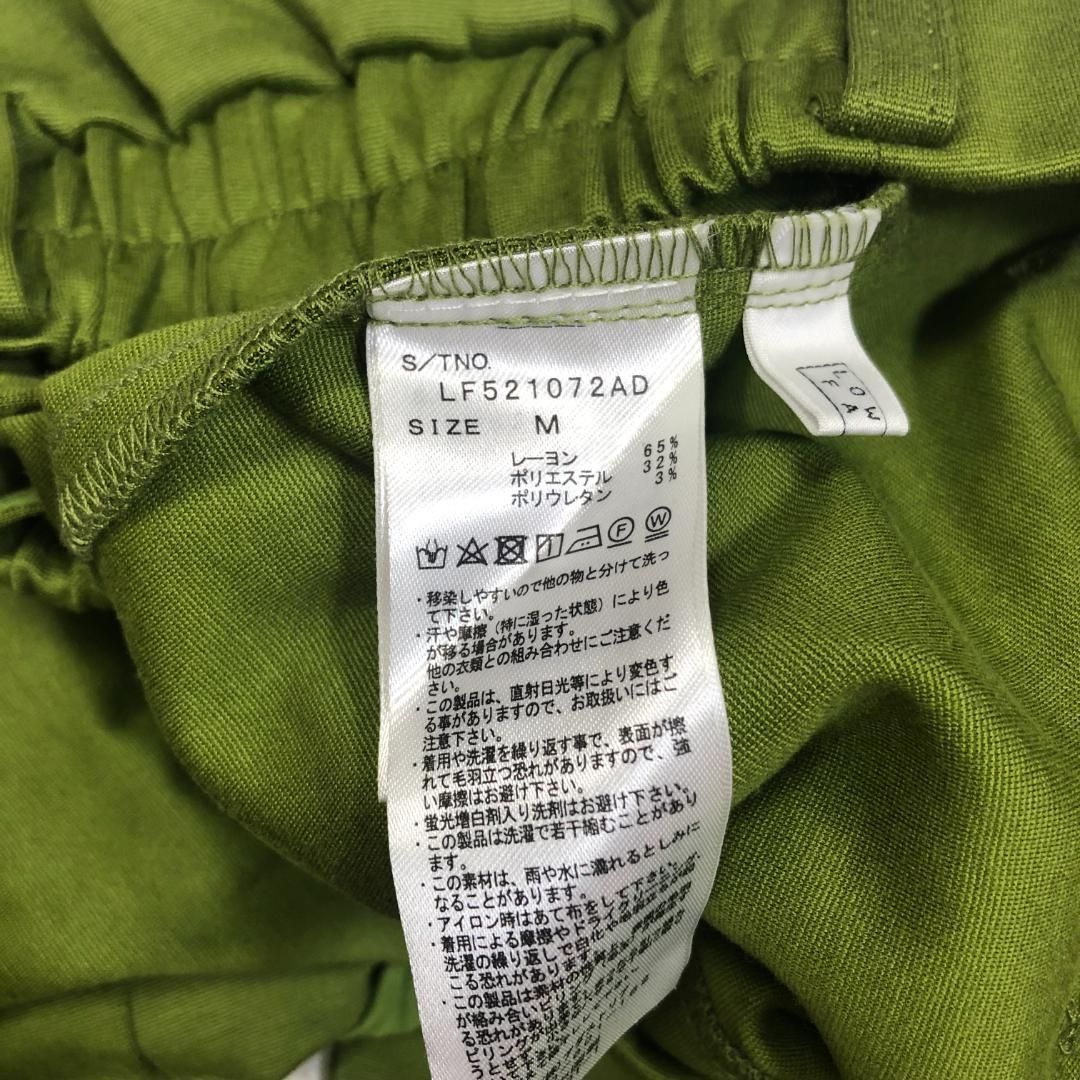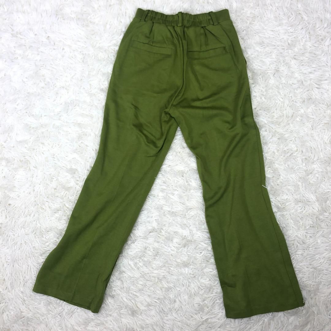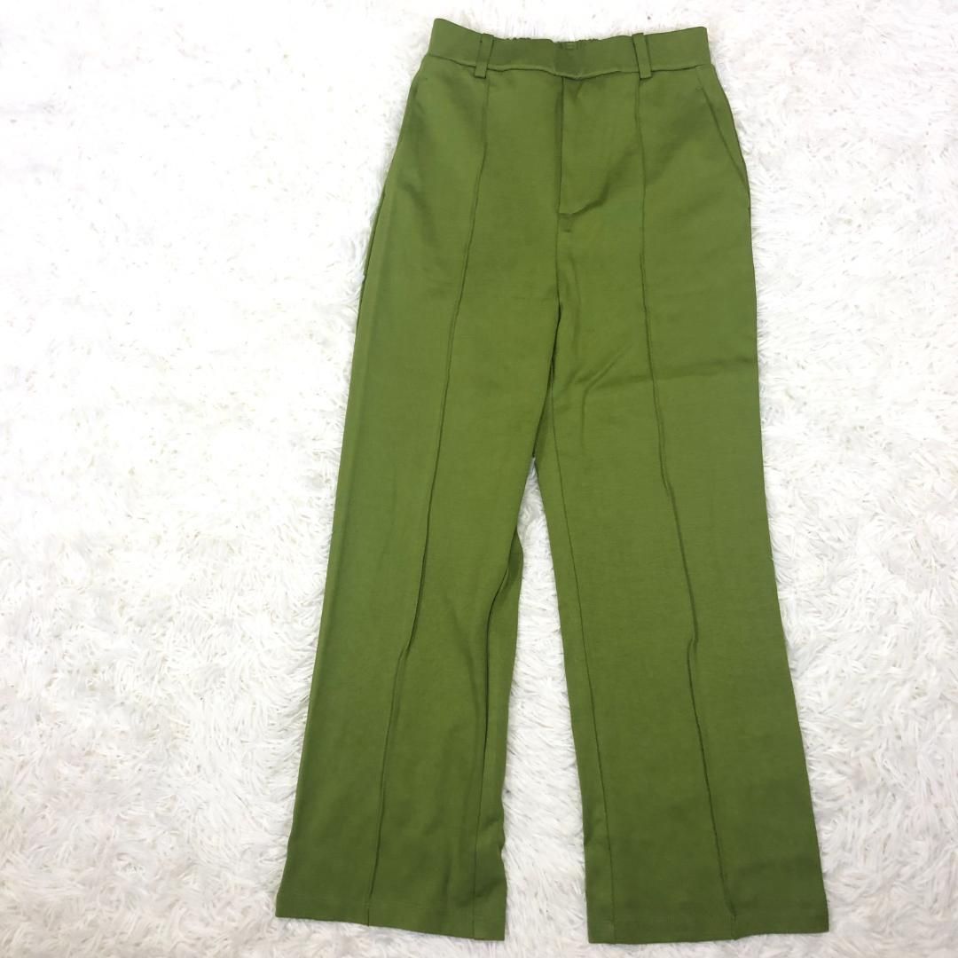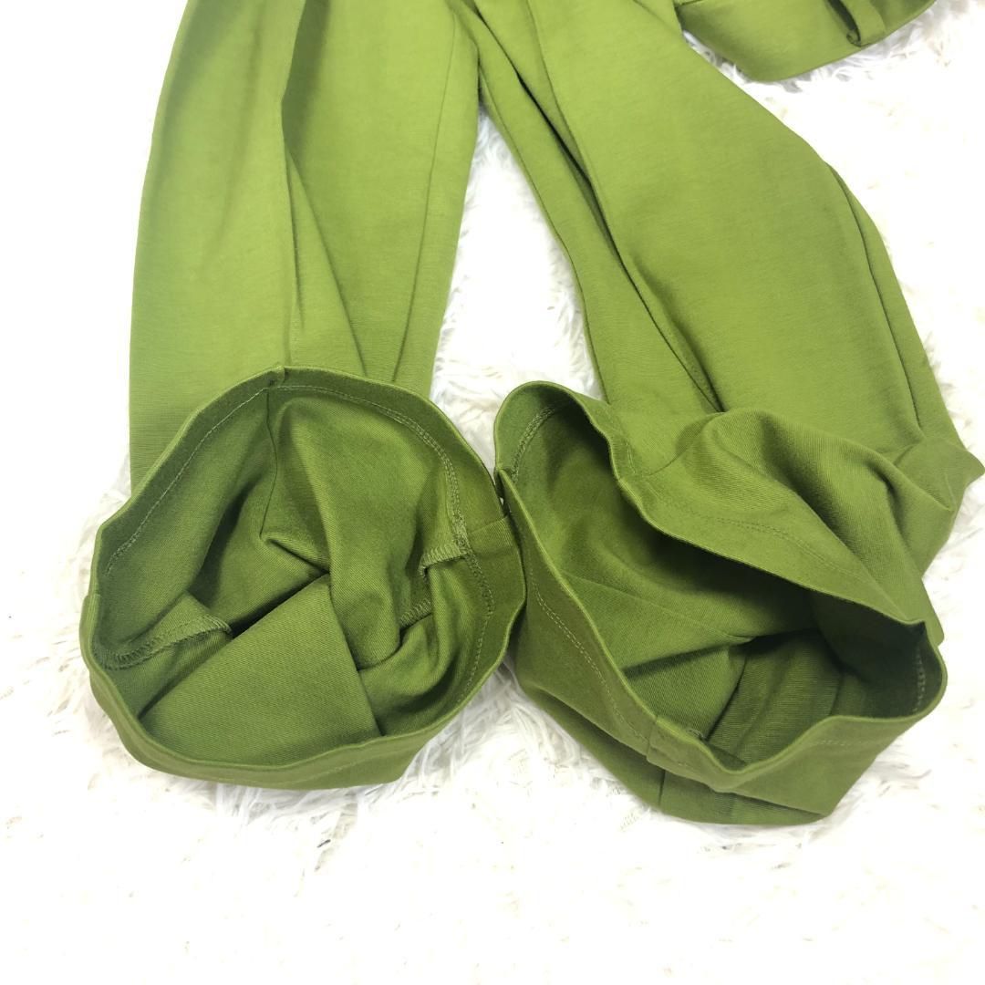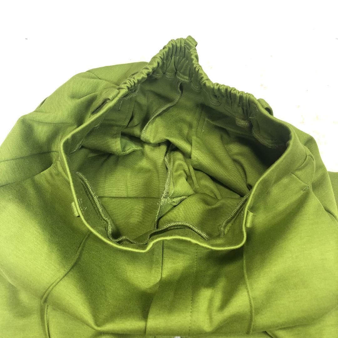 グリーン色、ウエスト総ゴムのイージーパンツです。ハイウエストデザイン・センタープレス入りでスタイルが良く見えます。ポケット4つ付きです。ストレッチが効いています。