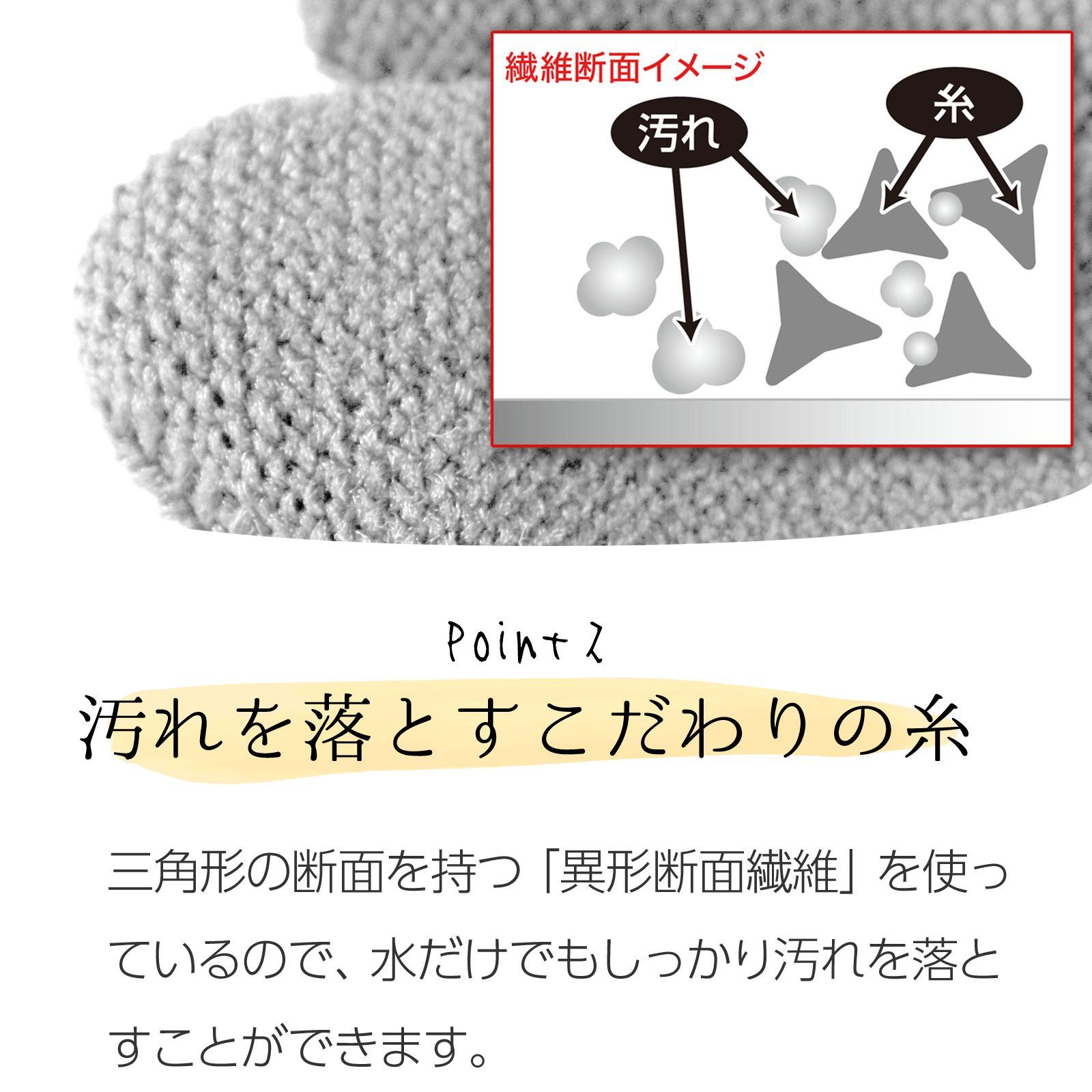 三角形の断面を持つ「異形断面繊維」が、水だけでもしっかり汚れをキャッチ!