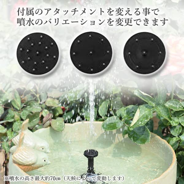 ガーデン用、太陽光発電のソーラーミニ噴水セット アタッチメントが付属しており、変更する事で噴水のバリエーションを変更できます。 ソーラーパネル式なので、電気代の心配もありません。 ※曇りや雨天の日は作動しません。