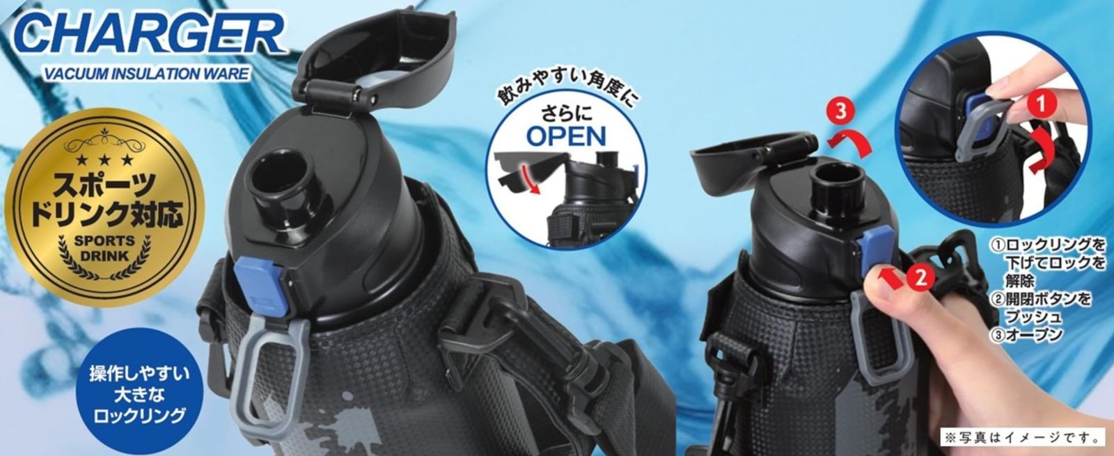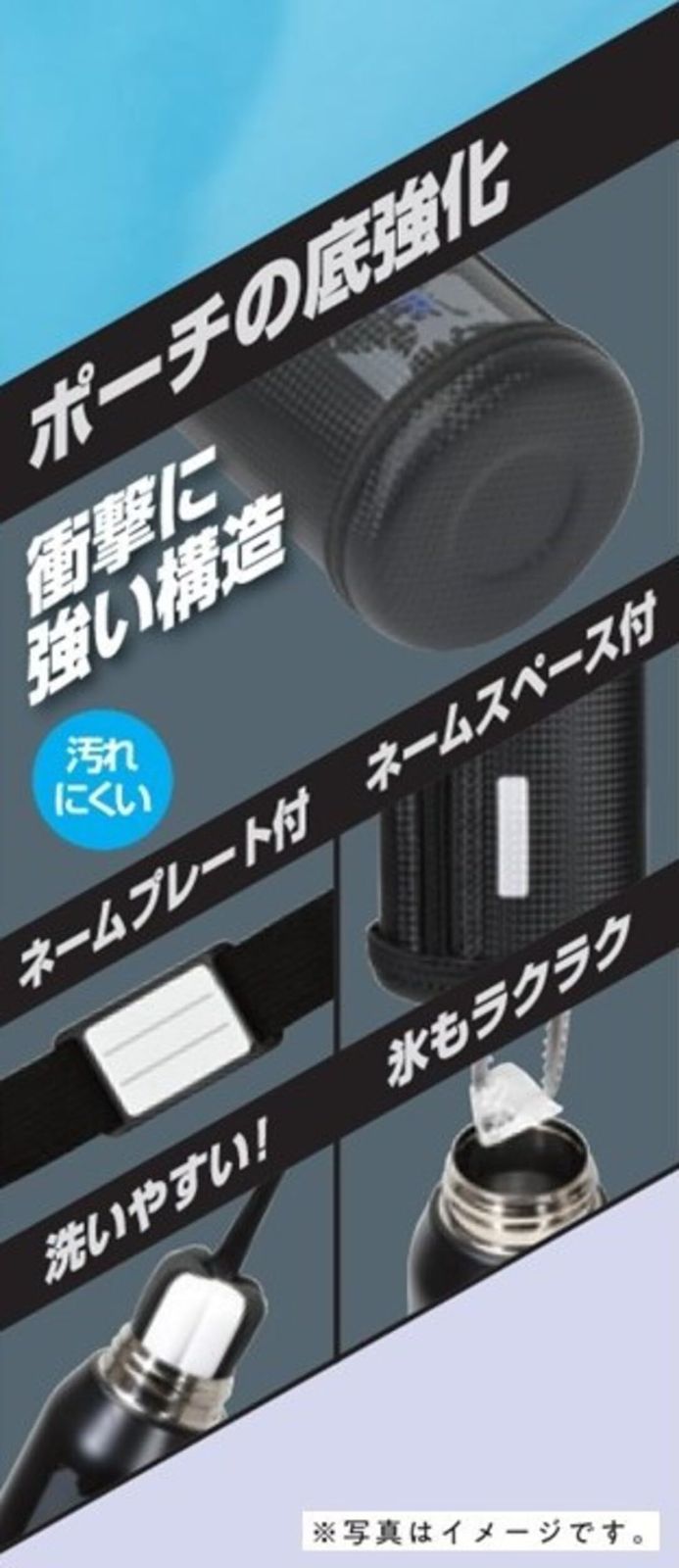 ○操作しやすい大きなロックリングタイプ!簡単にロックを解除できて、すぐ飲める大きなロックリング仕様です。 ロックリングを下げてロックを解除 開閉ボタンをプッシュ オープン 〇ポーチ底面は衝撃に強く、ボトルを衝撃から守ります。 〇口径は約5cmで広めなので、洗いやすく氷もラクラク! 持ちやすいベルト付ポーチで、名前を書けるネームプレート・ネームスペース付きです。 ※保冷専用 保冷効力 : 9度以下(6時間) 製品サイズ(約) : 幅95×奥行95×高さ345mm(ポーチ含まず) 製品重量(約) : 750g(ポーチ含む) 内びん : ステンレス鋼 胴部 : ステンレス鋼(アクリル樹脂塗装) ふた栓・キャップ : ポリプロピレン (耐熱温度100度/耐冷温度-20度) 開閉ボタン・リング : ABS樹脂 (耐熱温度80度/耐冷温度-20度) パッキン : シリコーンゴム (耐熱温度180度/耐冷温度-20度) ポーチ 表地 : 合皮皮革 裏地・ベルト : ポリエステル 中芯 : ポリエチレン 生産国 : 中国