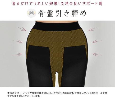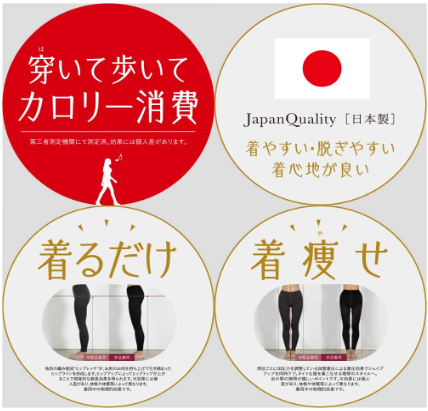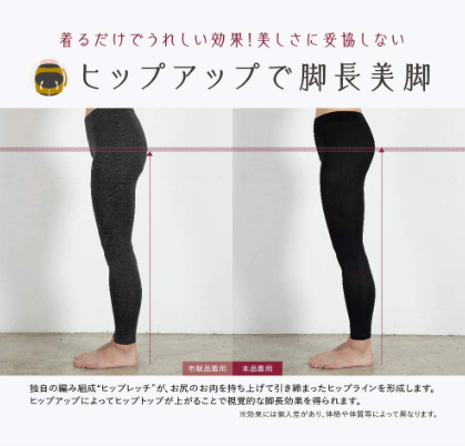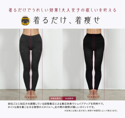 ◆着圧スリムレギンスの5つの良いところ◆その1、シェイプレッチ⇒人間工学に基づいて考案された独自の編み組織“シェイプレッチ”が、脚の筋肉にアプローチします。その2、ヒップレッチ⇒独自の編み組織“ヒップレッチ”が、脚の筋肉にアプローチし、お尻のお肉を持ち上げて引き締まったヒップラインを形成します。その3、段階加圧⇒足首、ふくらはぎ、太腿にかけて圧力を段階的にかけているため足全体にフィットして動き易い。引き締めによって見た目も理想のスタイルへ。その4、骨盤引き締め⇒帯状のサポートバンドが骨盤全体を優しくしっかりと引き締めます。骨盤を引き締めることによって立ち姿も美しく。その5、ファッションコーデにも⇒アウターに響きにくいよう極細の糸を使用しています。薄手でシンプルなため、季節を問わず通常のレギンスと同じようにご着用いただけます。※1)着用時のみの物理的効果