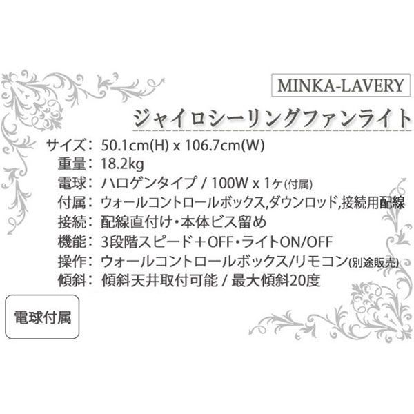 本体素材: スチールメタル|フィニッシュ: ベルカロウォールナット|シェード: ガラス|重量: 18.2kg|使用電球Mini-canハロゲンタイプ 電力: 最大100W x 1(付属)|付属品: 壁スイッチ,Mini-canハロゲン 100Wx1ヶ,ダウンロッド: 11cm/30cm(2本連結して使用は不可)|配線接続: 直接配線|操作: 壁スイッチ(付属),リモコン(別途販売)|傾斜: 20度まで,最大傾斜45度まで(別途販売アダプター使用の場合)|3段階スピード + OFF,ライトON/OFF|お部屋の目安: 6?12畳程