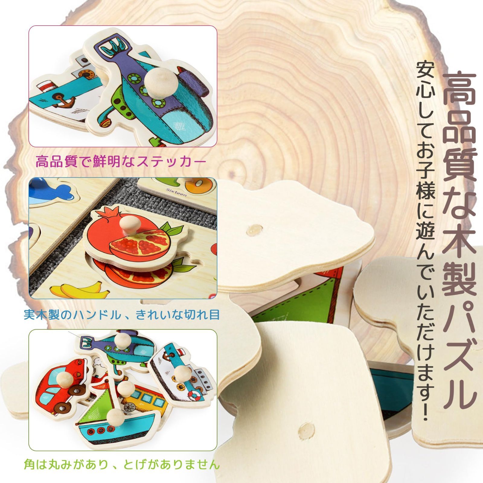 【製品仕様】この知育玩具は、長さ32cm×幅24cmで、重さは約200gです。この子供向けの教育的な木製パズルには8種類のタイプがあり、フルーツ/動物1/動物2/交通/海洋生物/野菜/数字 1 ~ 10/英語のアルファベットのテーマです。この早期教育玩具は、高品質の木材で作られており、エッジにバリはありませんので、お子様が安心して遊ぶことができます。
