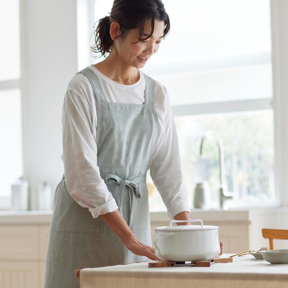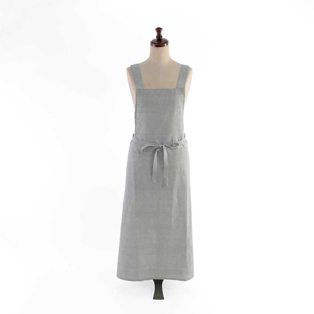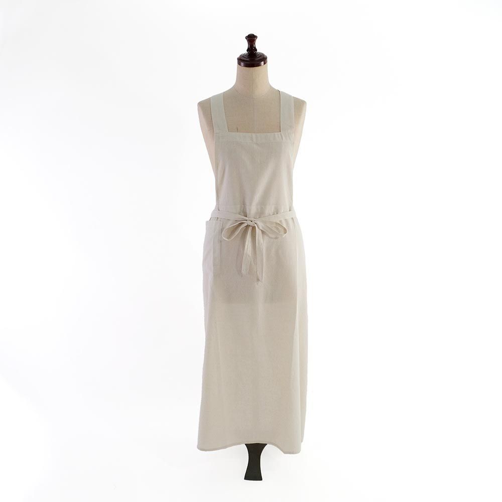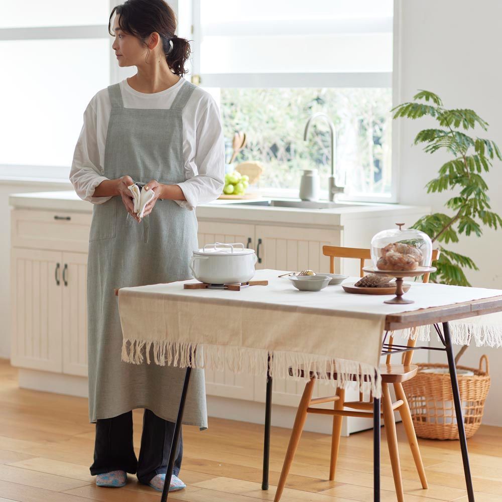 手紡ぎ手織りのカディで作られた風合い豊かなエプロン。シンプルでナチュラルなデザインは、料理や家事、ガーデニングシーンなど幅広くご使用いただけます。経糸と横糸の色が異なるシャンブレーで織り上げ、シャンブレー特有の色の奥行きによって微妙な表情を変え、シンプルながらも洗練された印象を与えます。