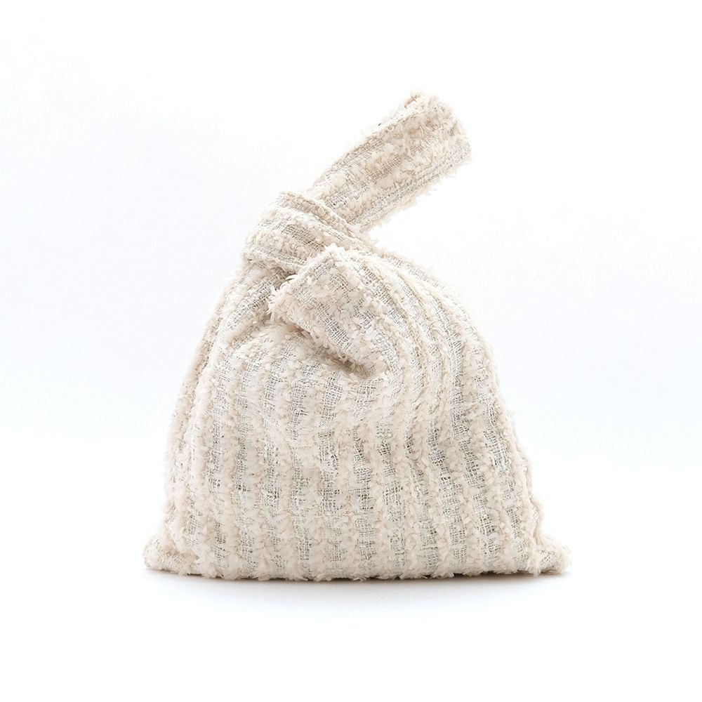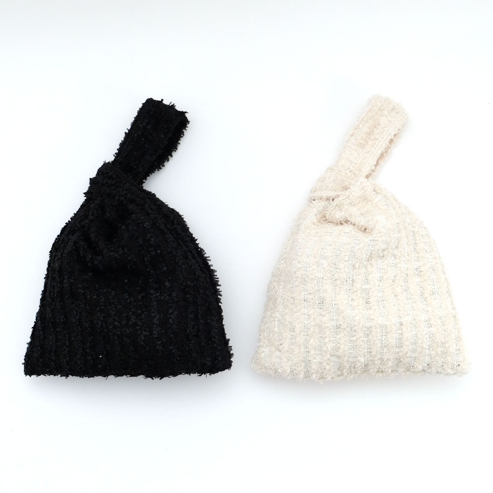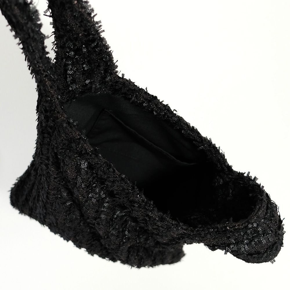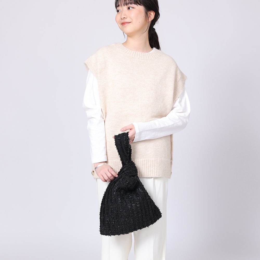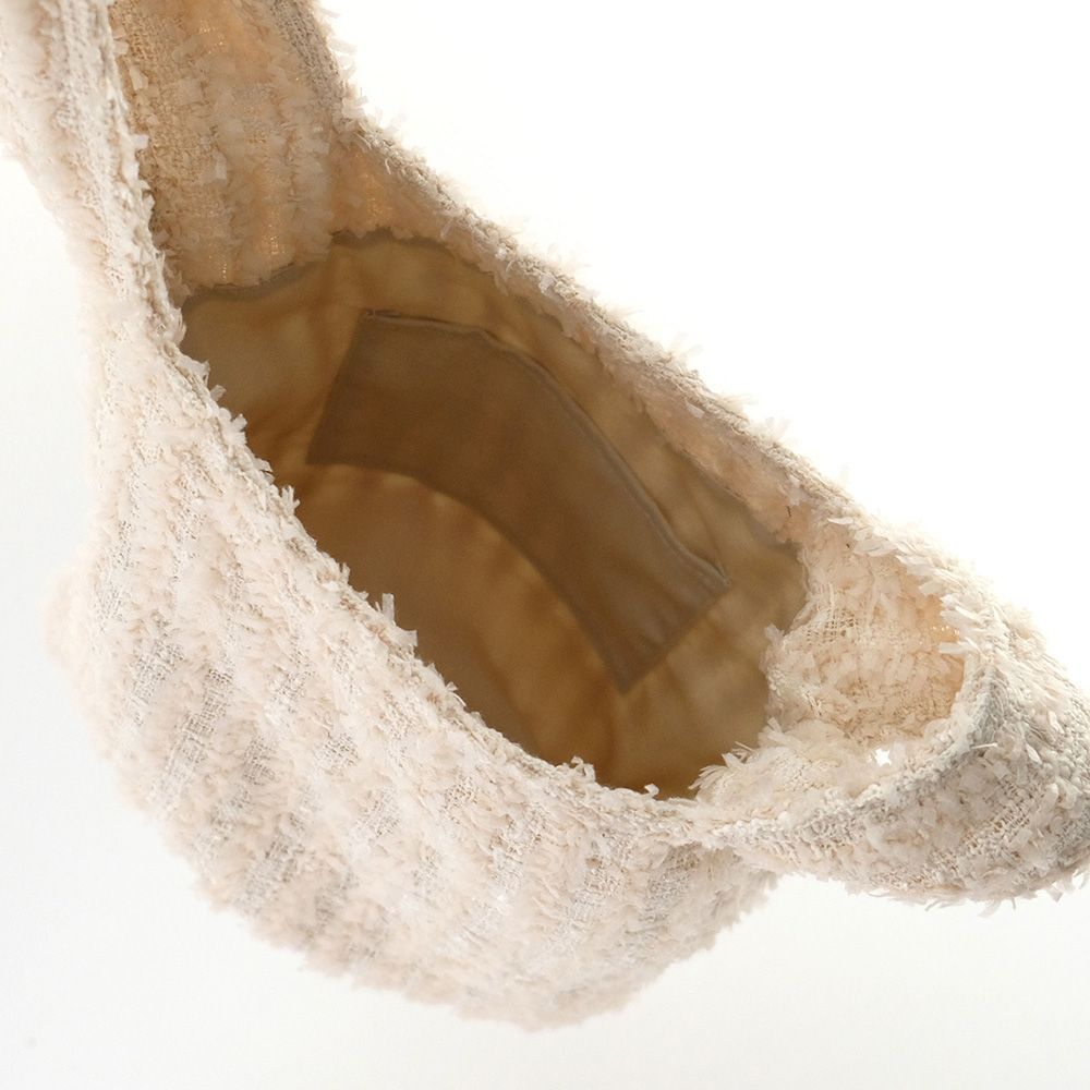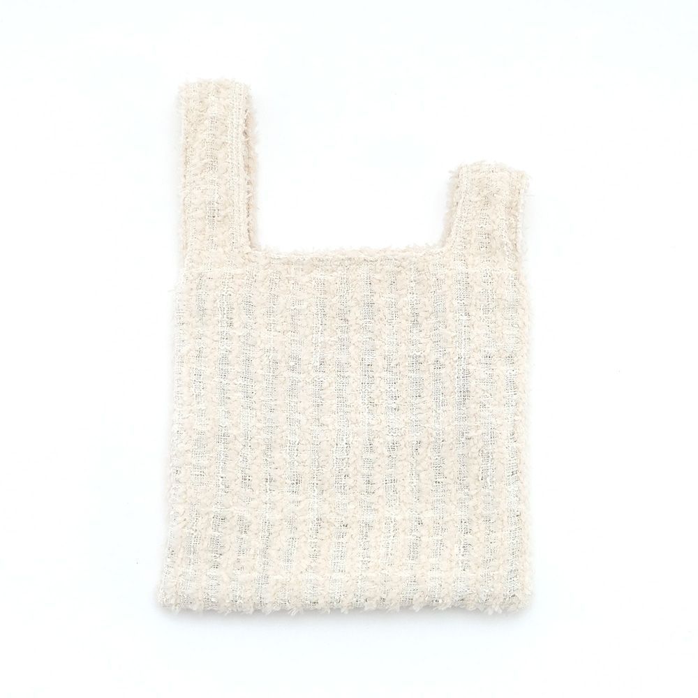 上品なファンシーツイードをあえてカジュアルなデザインに落とし込んで、普段使いしやすいバッグに仕上げました。華やかなリボンヤーンは素材自体が主役になるので、いつものスタイルに合わせるだけで着こなしをクラスアップしてくれます。