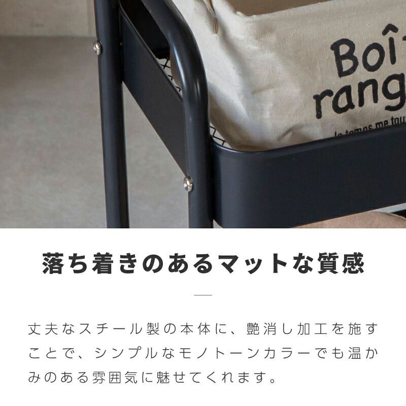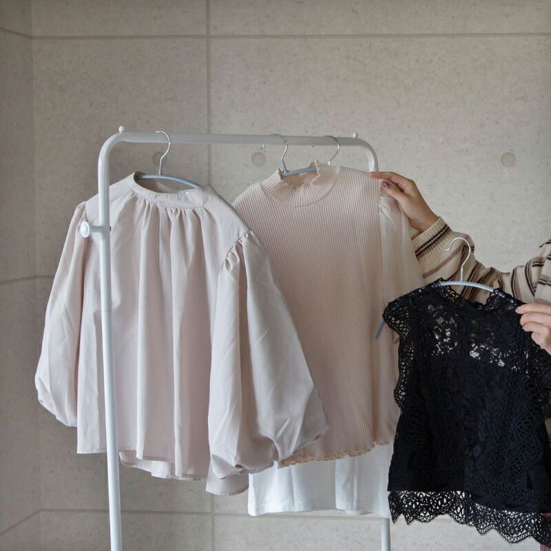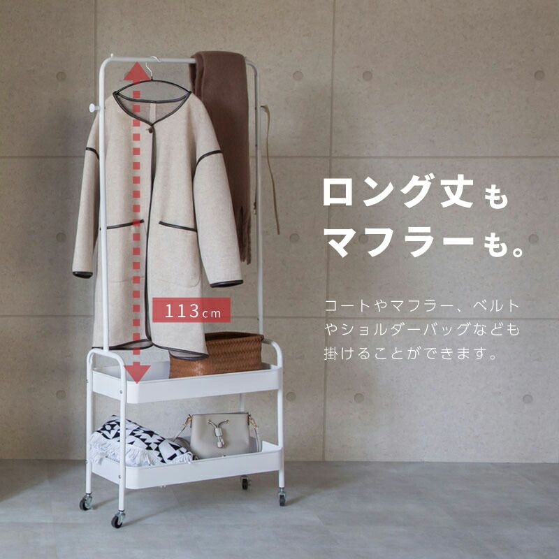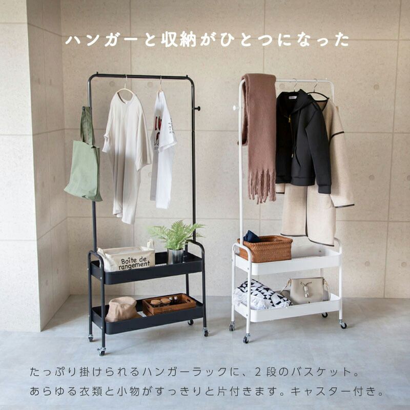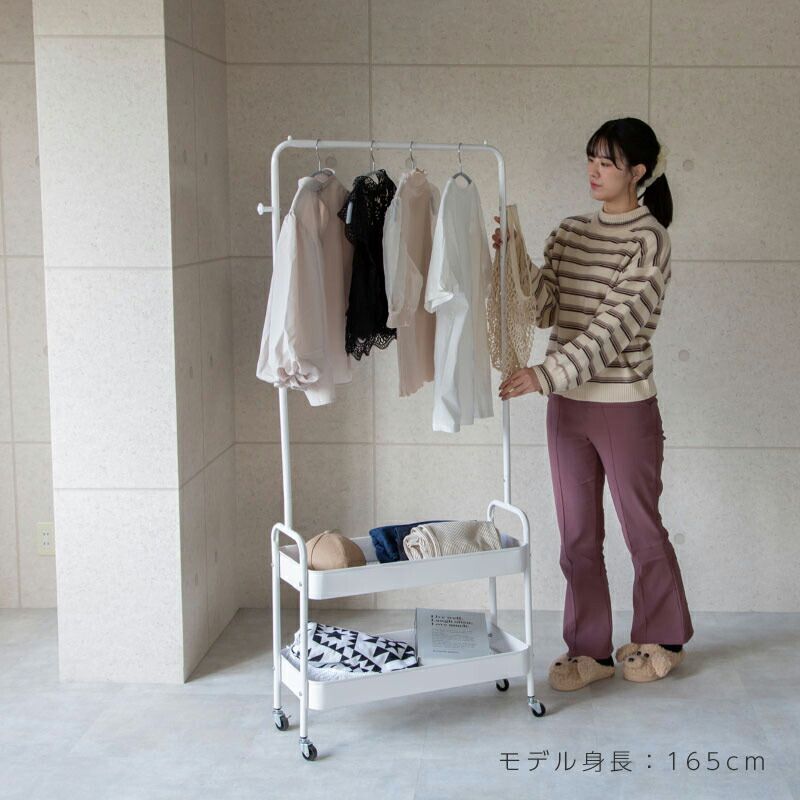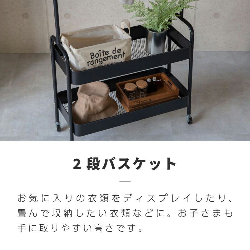 ハンガーの滑り落ち防止ストッパー付きで安心してお使いいただけます。下にはメッシュ底の2段バスケットがあり、畳んでしまいたい衣類や小物を収納できます。