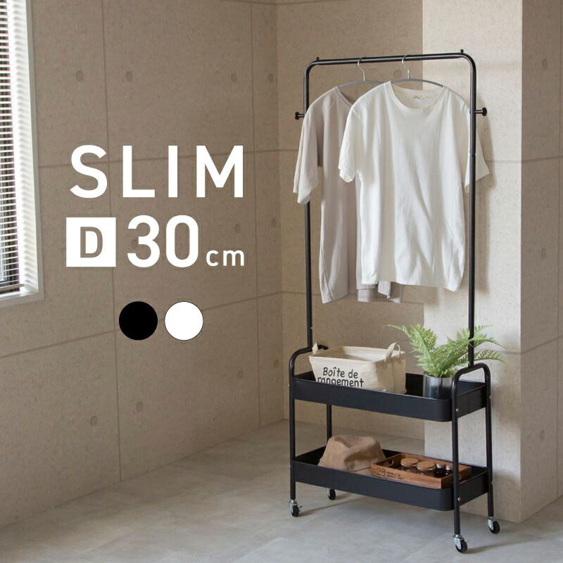 ハンガーと収納がひとつになった大容量のハンガーラックです。奥行はわずか30cmで省スペースに置けます。
