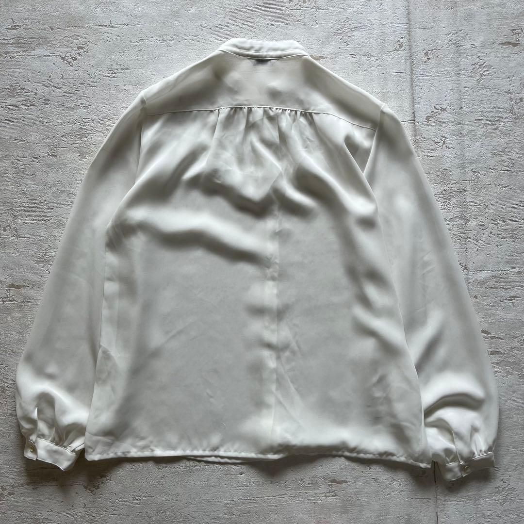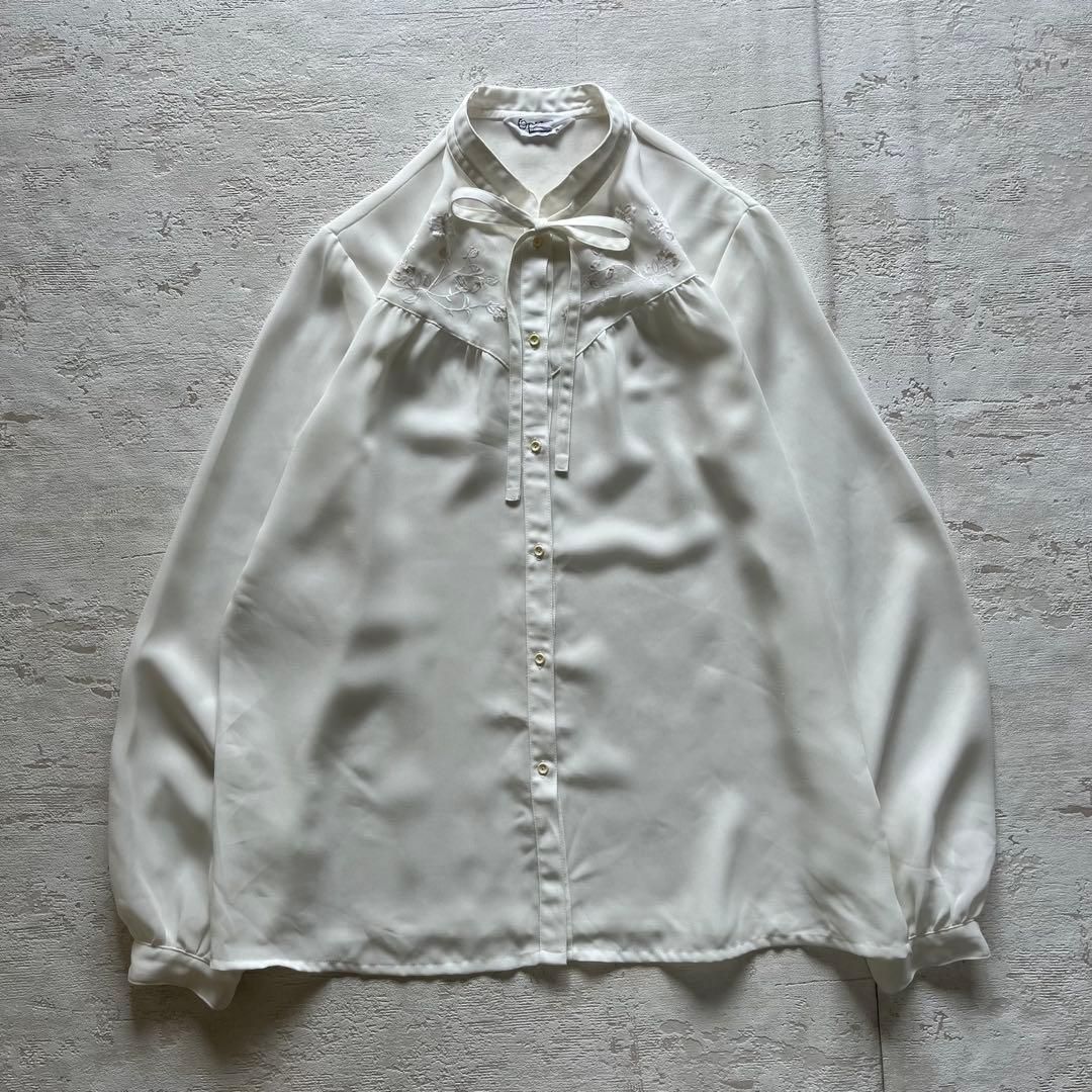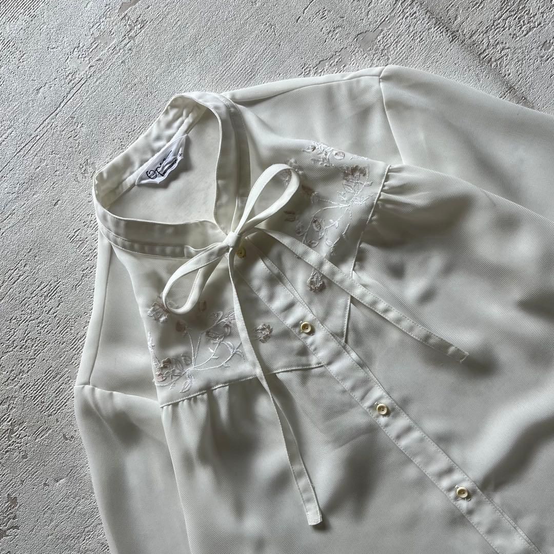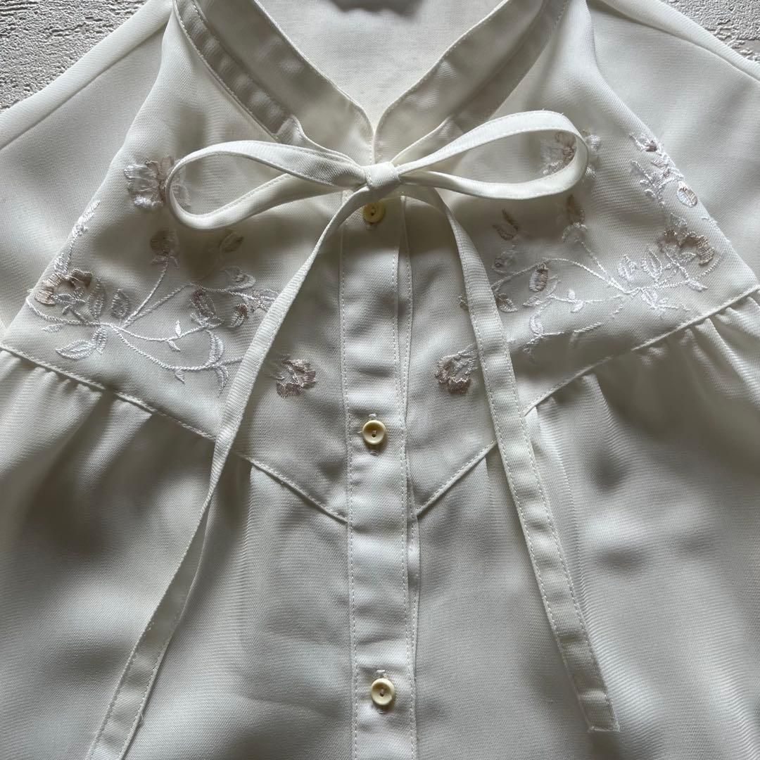 清楚でクラシカルな雰囲気漂うホワイトブラウスです。胸元には繊細なフラワー刺繍があしらわれ、さらにリボンタイ付きでフェミニンな印象を演出してくれます。シンプルながらも華やかさがあり、スカートやワンピースとの相性も抜群。昭和レトロやヴィンテージスタイルが好きな方、古着女子コーデを楽しみたい方におすすめです。普段使いはもちろん、ちょっとしたお出かけやフォーマルシーンにも活躍できる万能アイテム。雰囲気のある一枚をお探しの方にぴったりです。