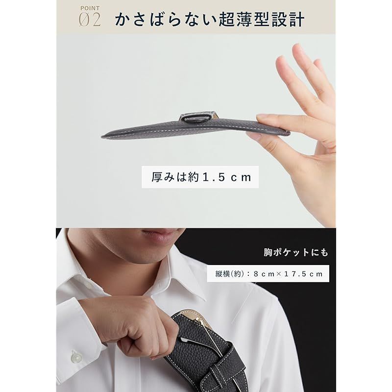 Point1 / 超軽量のコンパクト設計。外寸 横 17cm×縦 8cm、厚み約1~2(ベルト含む)cm。重さはわずか30g。できるだけ大きなメガネケースを持ち運びたくない、シンプルながらも個性もある物が欲しい といった方にもおススメです。