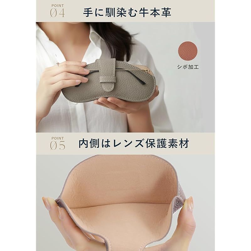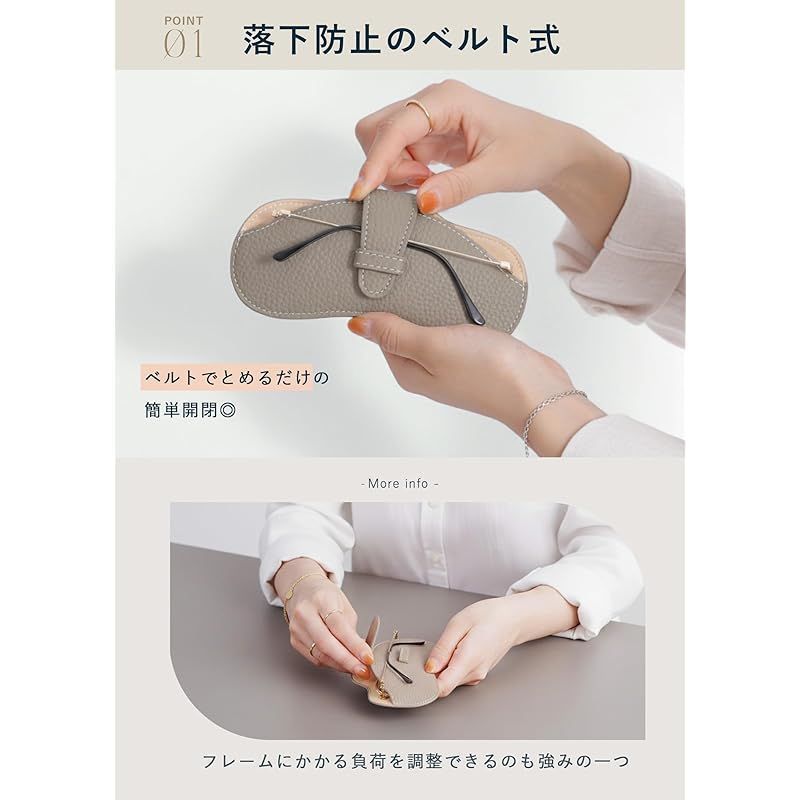 Point4 / 使い勝手に優れたベルト式を採用。メガネのテンプルをベルトで固定してバッグ等にサッと忍び込ませるだけ。ベルトタイプは使い勝手がよく、スムーズでストレスフリーな開閉が可能です。又、レンズを傷つけないように内側はクッション性の高いベロアとなっています。