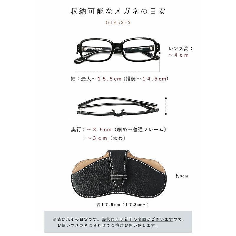 収納可能なメガネサイズの目安 レンズ高:~4cm フレーム幅;最大~15.5cm(推奨~14.5cm) 奥行:~3.5cm(細め~普通フレーム) :~3cm(太め)