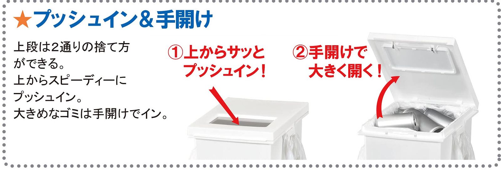 サイズ:奥行41×横27×高さ87cm、容量:55L(上段:32L 下段:23L)、重量、3.26kg、材質:本体=ポリプロピレン プッシュフタ・バネ=ステンレス キャスター=ポリプロピレン、ポリカーボネート、スチール、生産国:日本