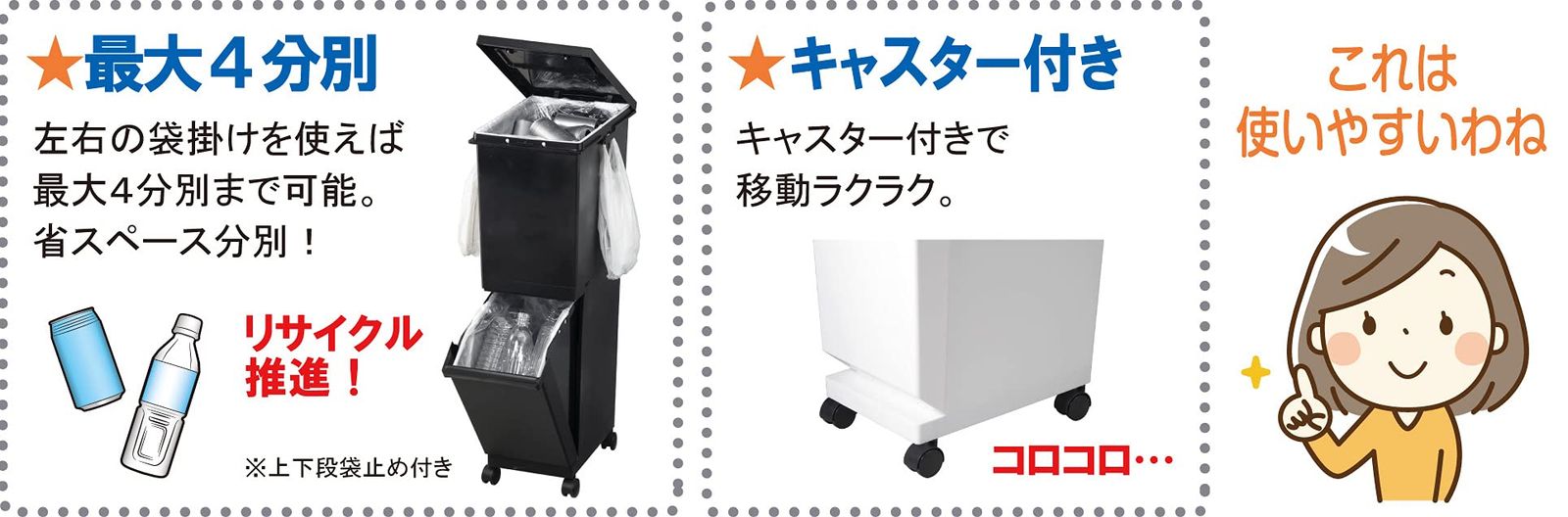 左右に袋を掛けられる便利なフックが付いていて、ペットボトルキャップ・紙パックなどの資源ごみを分別する事ができる