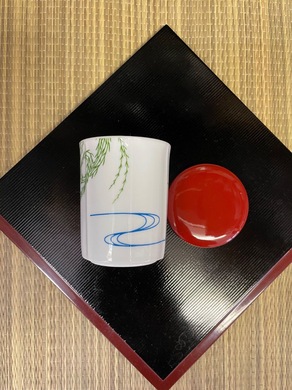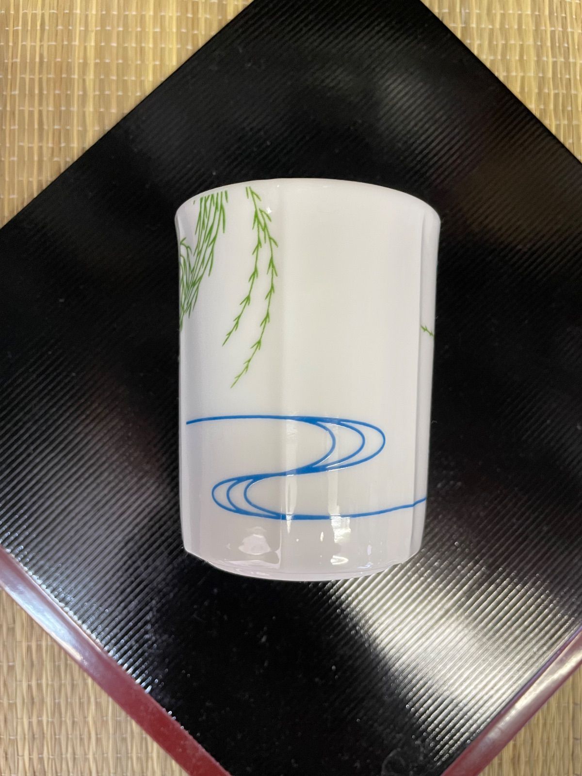 湯呑み 結び柳に流水 白地に草色の柳柄に青の流水柄