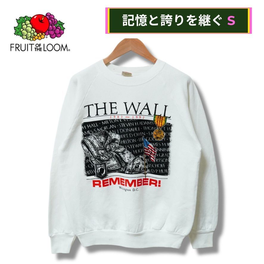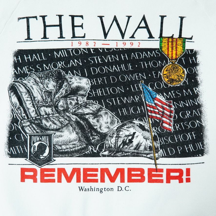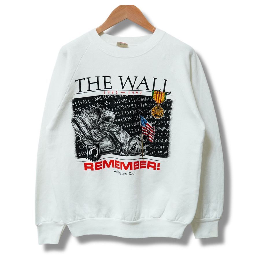 90s FRUIT OF THE LOOM製、“THE WALL”モチーフのアートスウェット。戦没者慰霊をテーマにした重厚なグラフィックと、“REMEMBER!“の赤が印象的で、静かな強さを感じるデザインです。USA製のしっかりしたスウェット地は、着込まれてこなれた質感に。