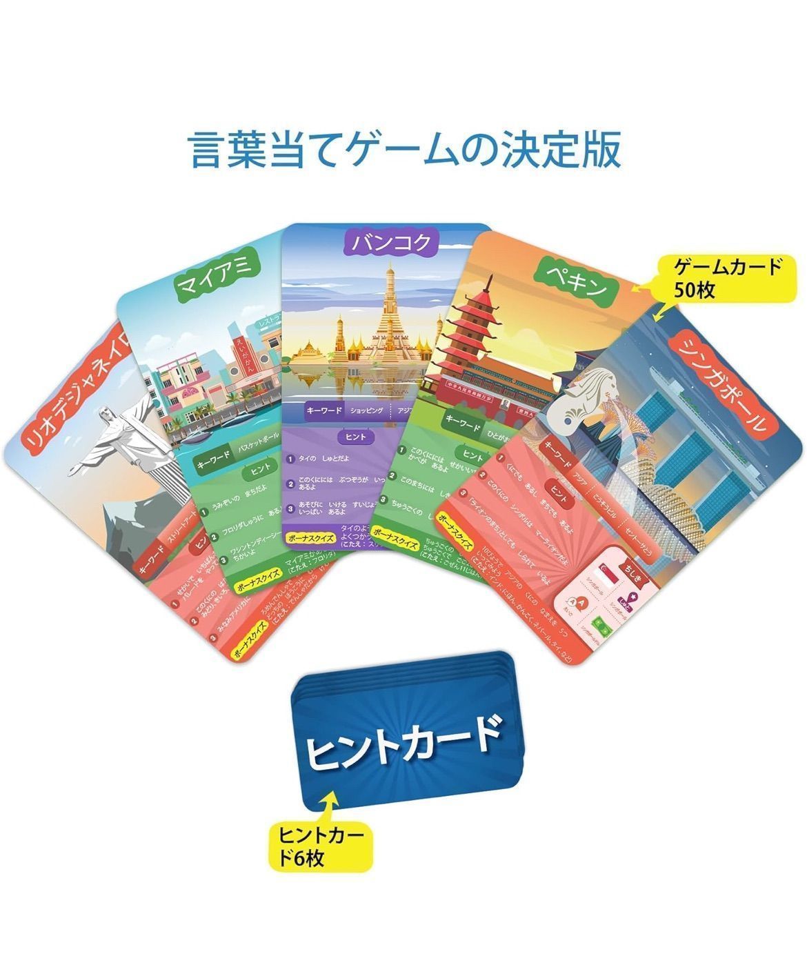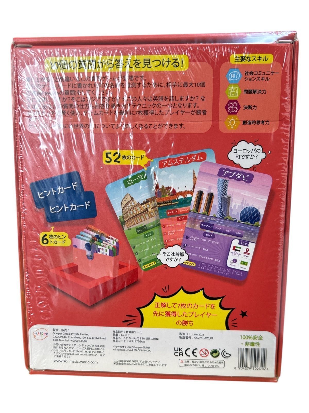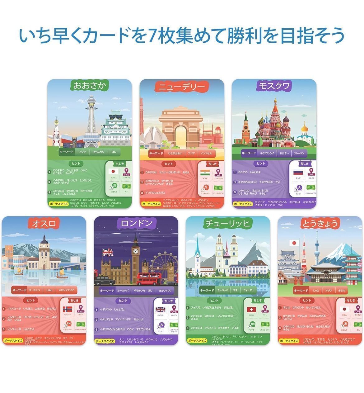 質問して頭が良くなるお手軽ゲーム: チームに分かれるか1対1でプレイして、ゲームカードに書かれた国について、10個まで質問しましょう!その町はアジアにある?観光地?国の首都?よく考えて賢く質問して、ヒントカードを賢く使いましょう。最初に7枚のゲームカードを集めた人が勝者になります!