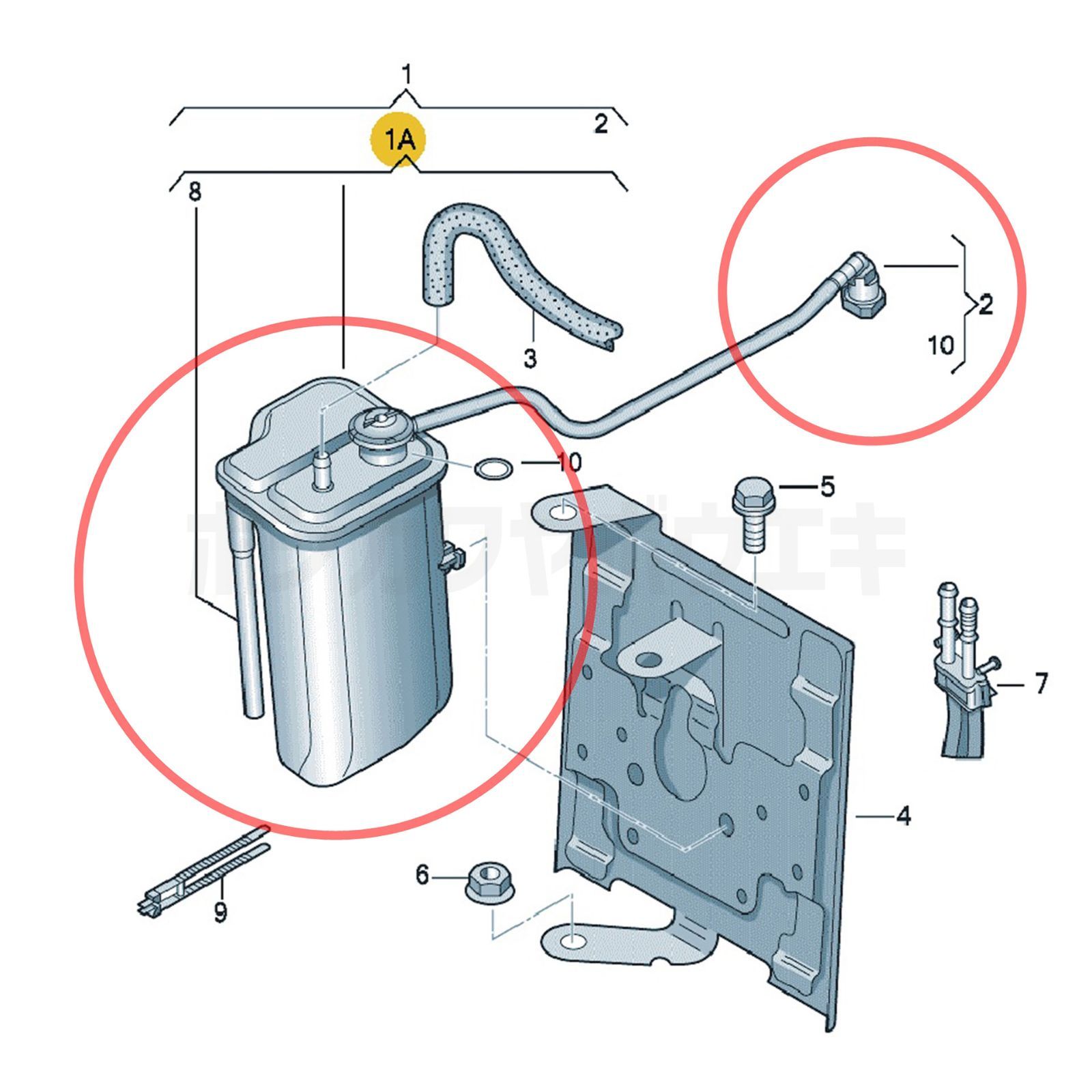 VW/AUDI車のチャコールキャニスターは、 内部の劣化でボロボロになった内部の吸収剤が流出。配管が詰まることによりエンジンチェックランプが点灯します。