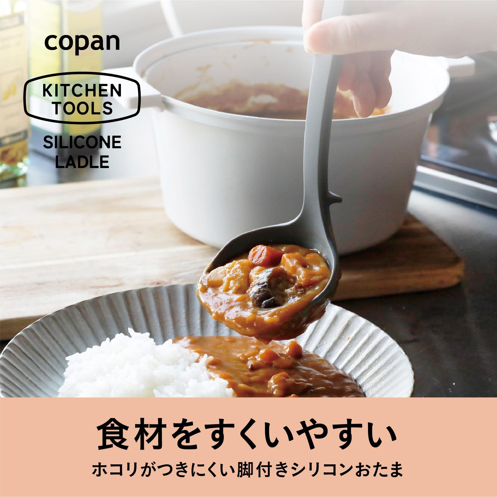 おたまの先端が平らなので、フライパンや鍋にぴったり密着する「copan(コパン) 食材をすくいやすいシリコン脚付きシリコンおたま」
