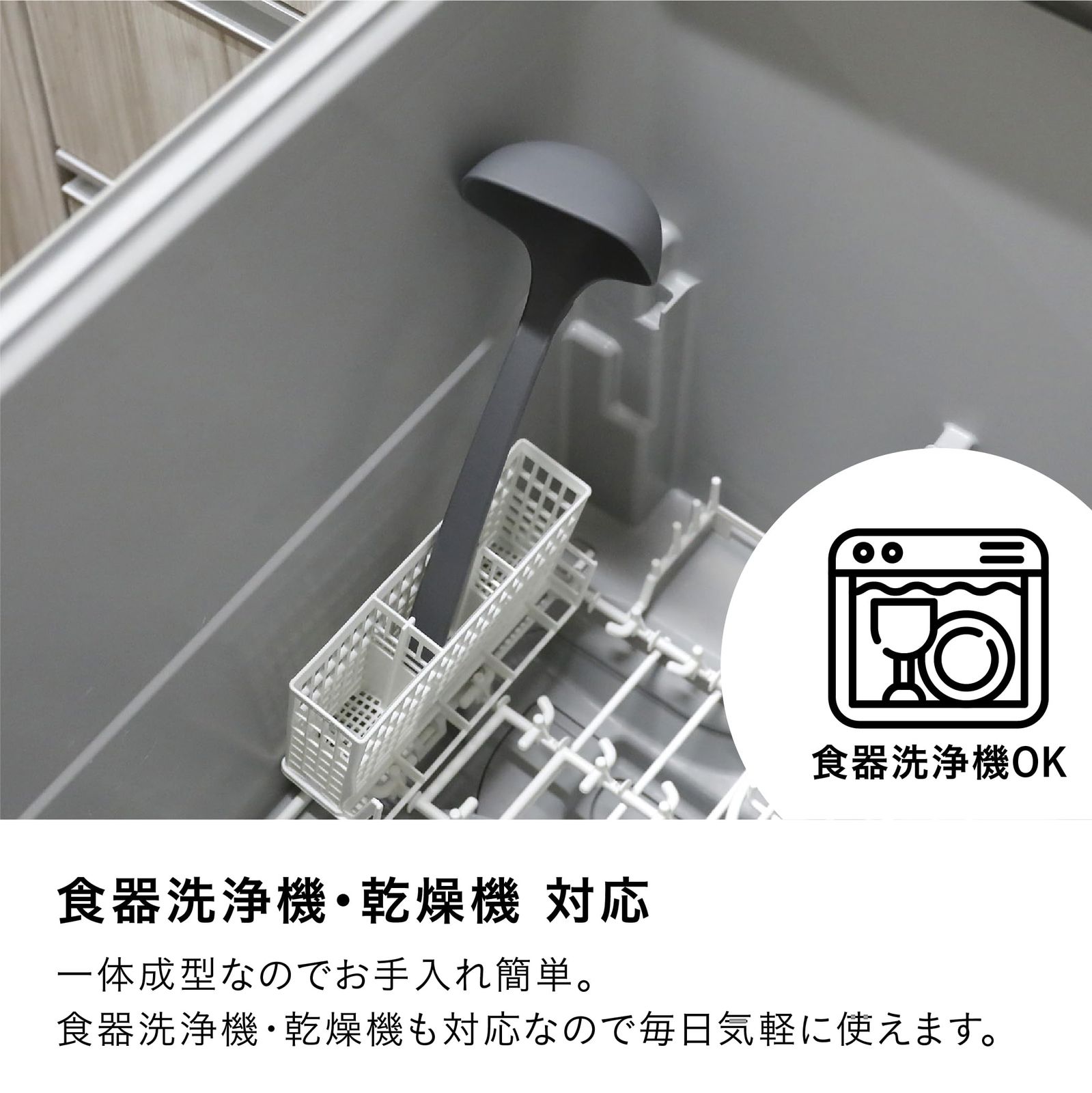 継ぎ目のない設計で汚れが落ちやすく、食器洗浄機対応なのでお手入れも簡単。脚付き仕様なので先端がキッチン台などに触れず、置き場所にも困ることなく衛生的です