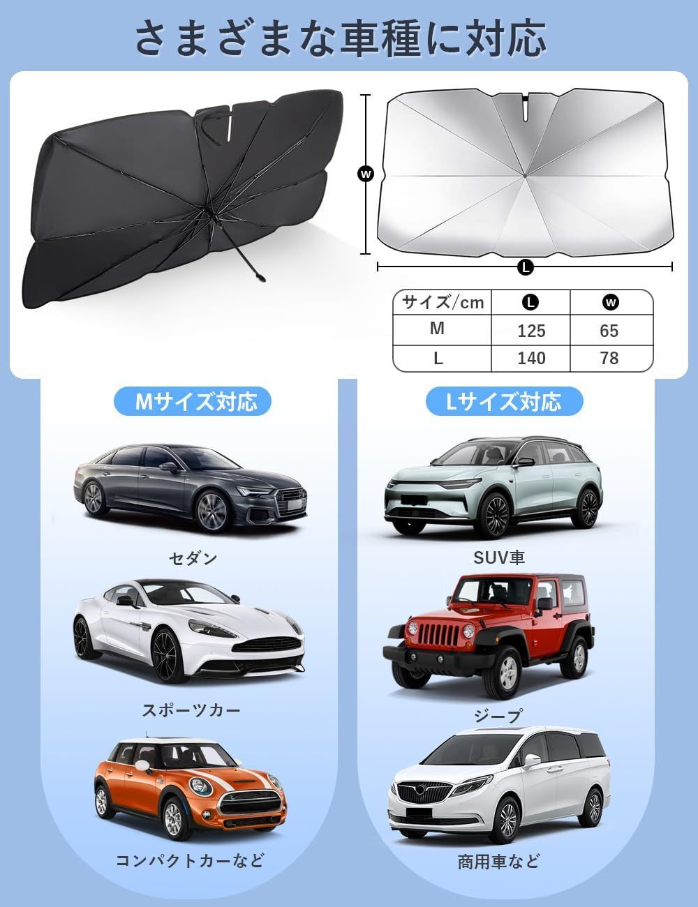 Mサイズ(125x65cm)はセダン、スポーツカー、軽自動車、コンパクトカーなどの小型車に適用されます。