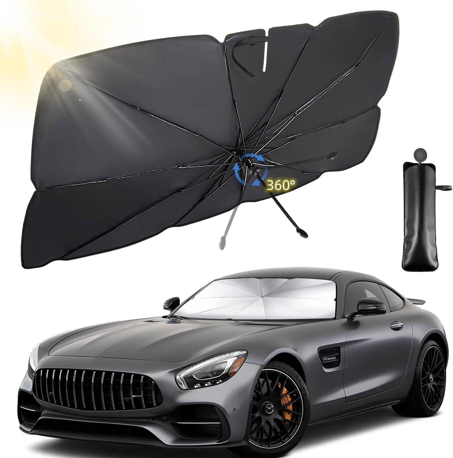 車用サンシェード 【2023強化版 10本骨&折り畳み式】サンシェード 車 フロントサンシェード 車用パラソル 傘型 車サンシェード日除け UVカット 紫外線対策 6層ナノ断熱素材 遮光断熱 車中泊 プライバシー保護 暑さ対策 コンパクト 取付簡単 内装劣化防止 革収納バッグ付きM(125*65CM)