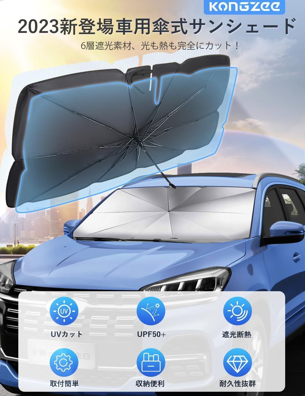この車用サンシェードは傘型のデザインを採用して、開けるだけで使用できます。