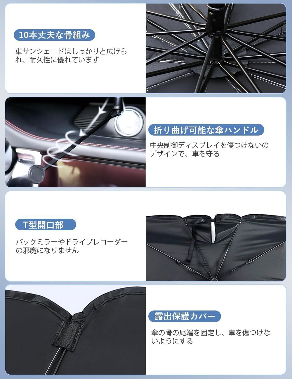 折り畳み式車サンシェードは10本頑丈な黒鋼骨製傘骨を採用し、製品の安定性を確保するだけでなく、耐久性も大幅に向上します。