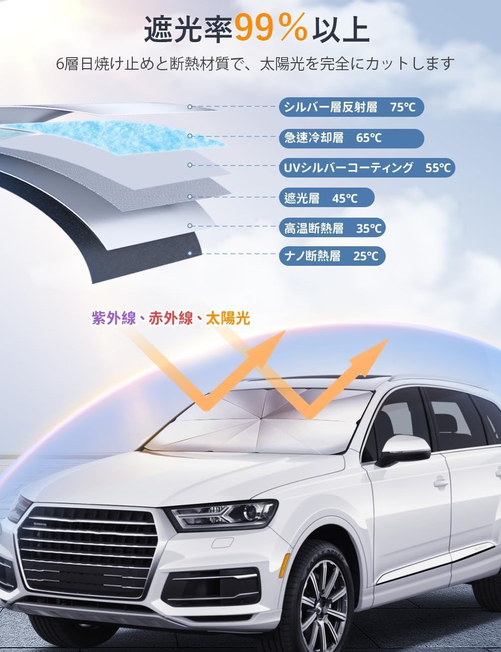 この車用サンシェードは6種類ナノ高分子材料を採用し、外側はチタンシルバーコーティングで、太陽を遮り、紫外線によるダメージを99%ブロックするだけでなく、効果的に冷却することもできます。